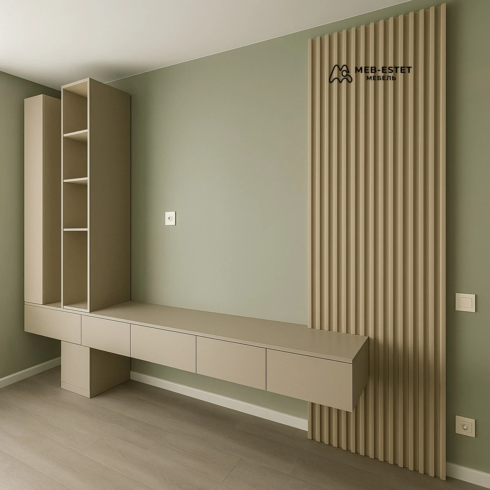 Элегантная подвесная консоль с открытыми модулями и реечной декоративной панелью. Лаконичная геометрия и скрытая фурнитура сочетаются с прочной конструкцией из ЛДСП/МДФ с эмалевым матовым покрытием.