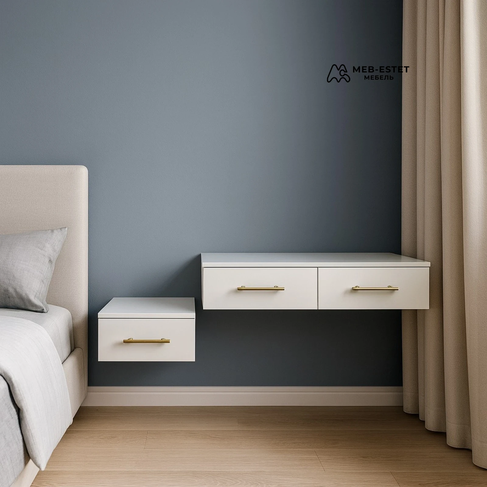 Подвесная наборная тумба для спальни в современном стиле. Корпус выполнен по индивидуальным размерам, фасады из МДФ с эмалевой матовой отделкой, крупные металлические ручки с золотистым покрытием. Скрытый крепеж обеспечивает чистую геометрию стены и удобство уборки.