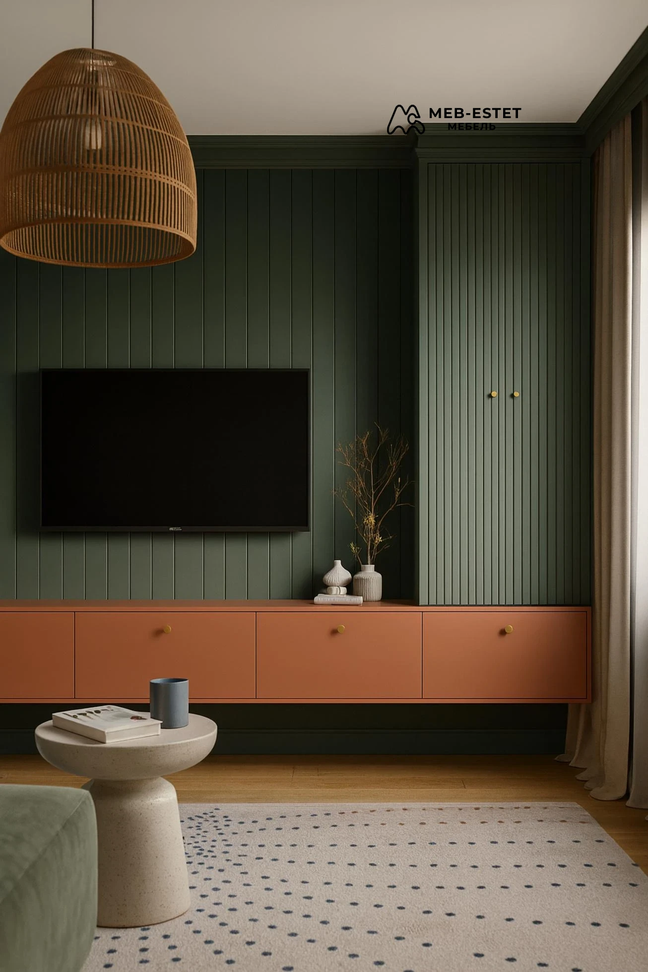 Элегантная подвесная тумба и реечная стенка, выполненные на заказ по индивидуальным размерам. Матовые фасады и вертикальная реечная панель создают спокойный, премиальный образ гостиной.
