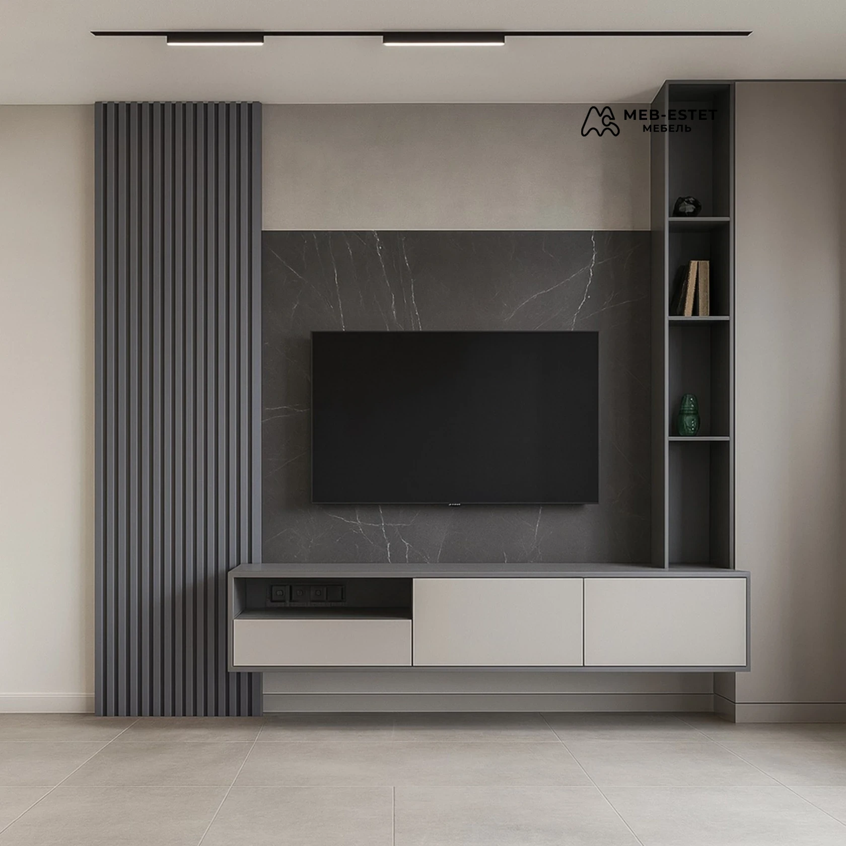 Элегантная подвесная стенная тумба под телевизор с открытым стеллажом — решение в стиле минимализм. Конструкция на основе МДФ, матовая отделка, бесшовная интеграция кабель-каналов и скрытое крепление обеспечивают чистую геометрию фасада.