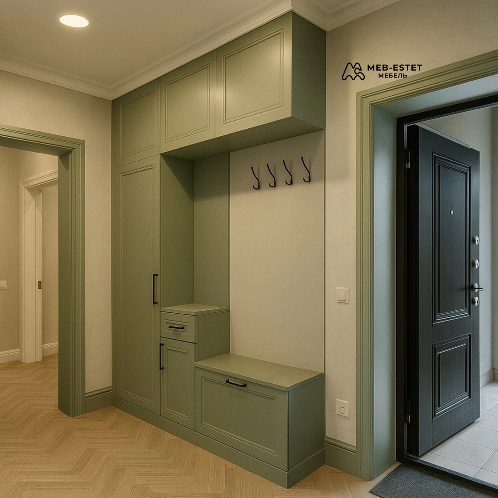 Комплексная мебель для прихожей: корпусный шкаф с антресолью, откидной ящик для обуви и встроенная сидушка. Изготовлено из окрашенного МДФ в матовом исполнении с рельефной филёнкой — выглядит как неоклассика в современной интерпретации.