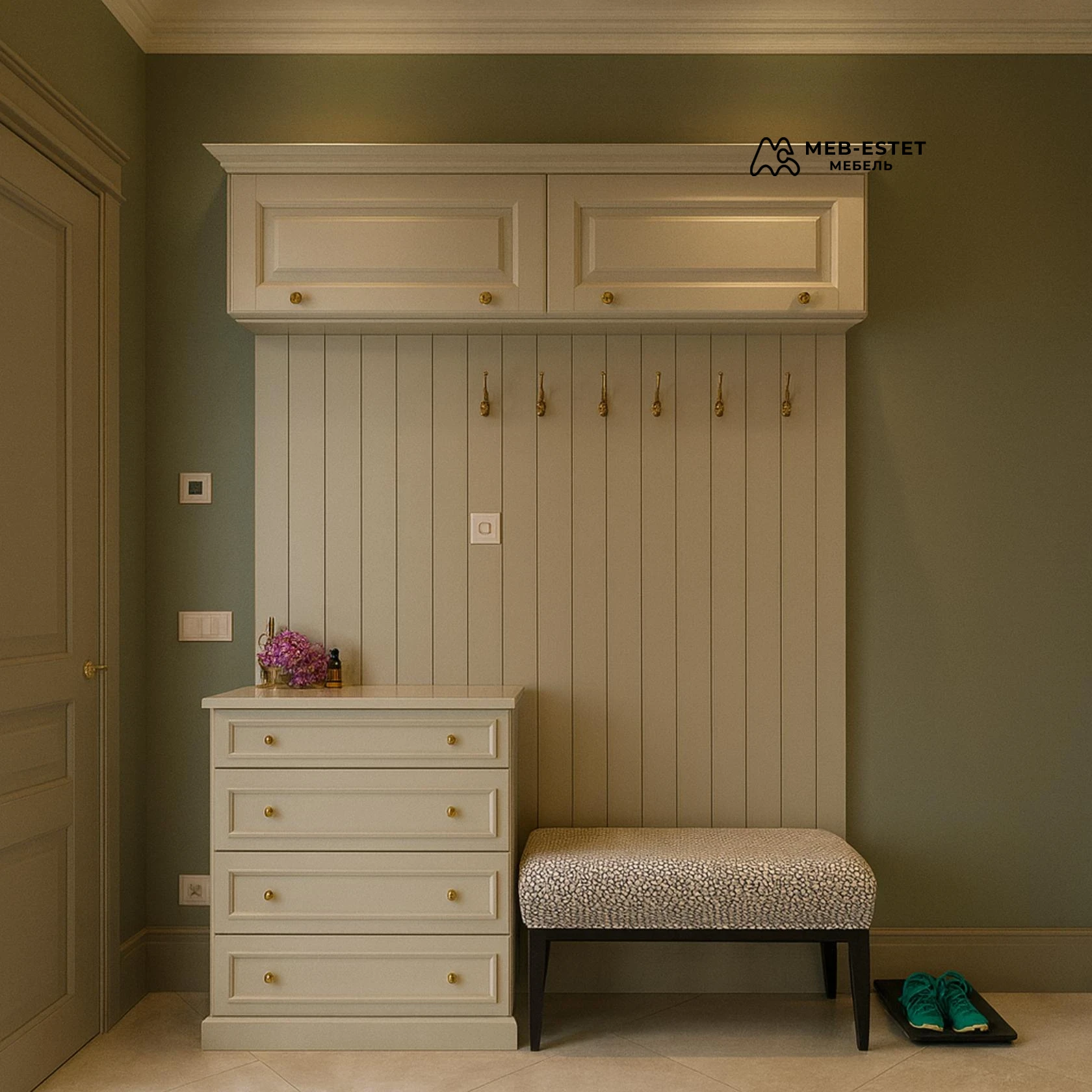 Компактная премиальная мебель для прихожей: комод с четырьмя выдвижными ящиками, панель с крючками и подвесные антресоли. Выполнено в неоклассическом стиле с фрезеровкой и карнизом, матовая краска на МДФ с эмалевым покрытием и латунной фурнитурой.