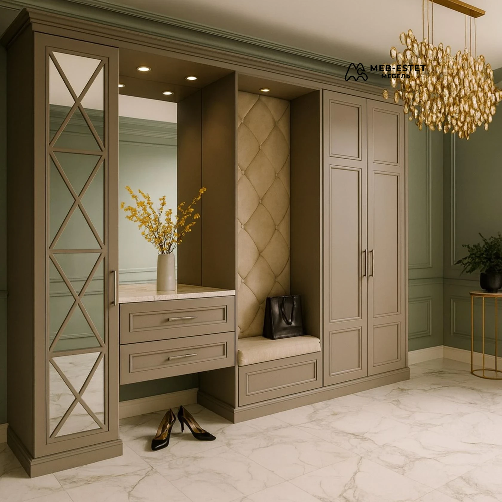 Комплект прихожей в неоклассическом стиле, выполненный под индивидуальный размер. Корпус из МДФ с филёнчатыми фасадами, зеркальная панель с декоративной раскладкой и встроенная мягкая банкетка со стёганой спинкой.