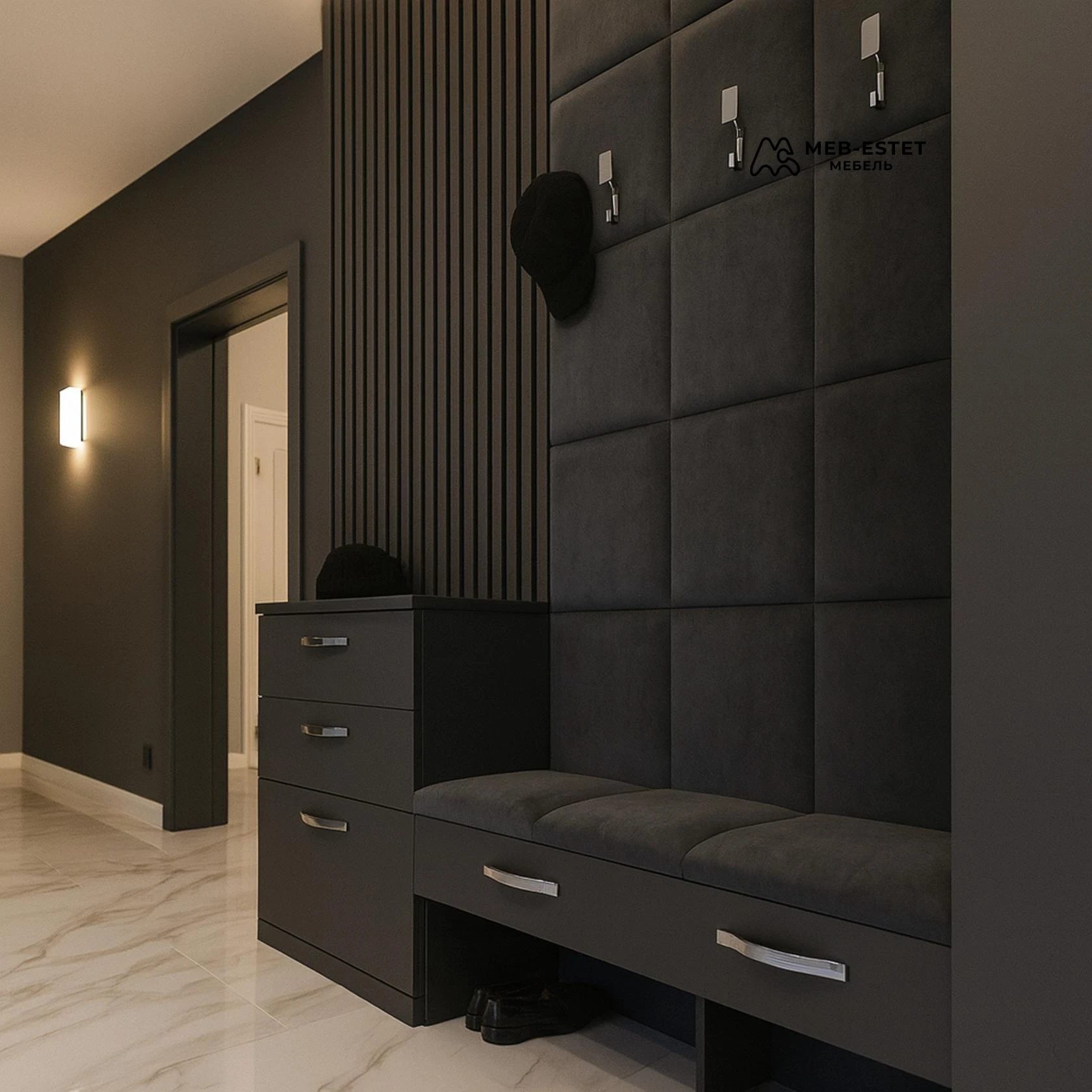 Компактная премиальная прихожая на заказ: мягкая стеганая панель, встраиваемая скамья с ящиками и высокий тумбовый модуль. Решение оптимально для узкого коридора и обеспечивает удобное хранение обуви и верхней одежды.
