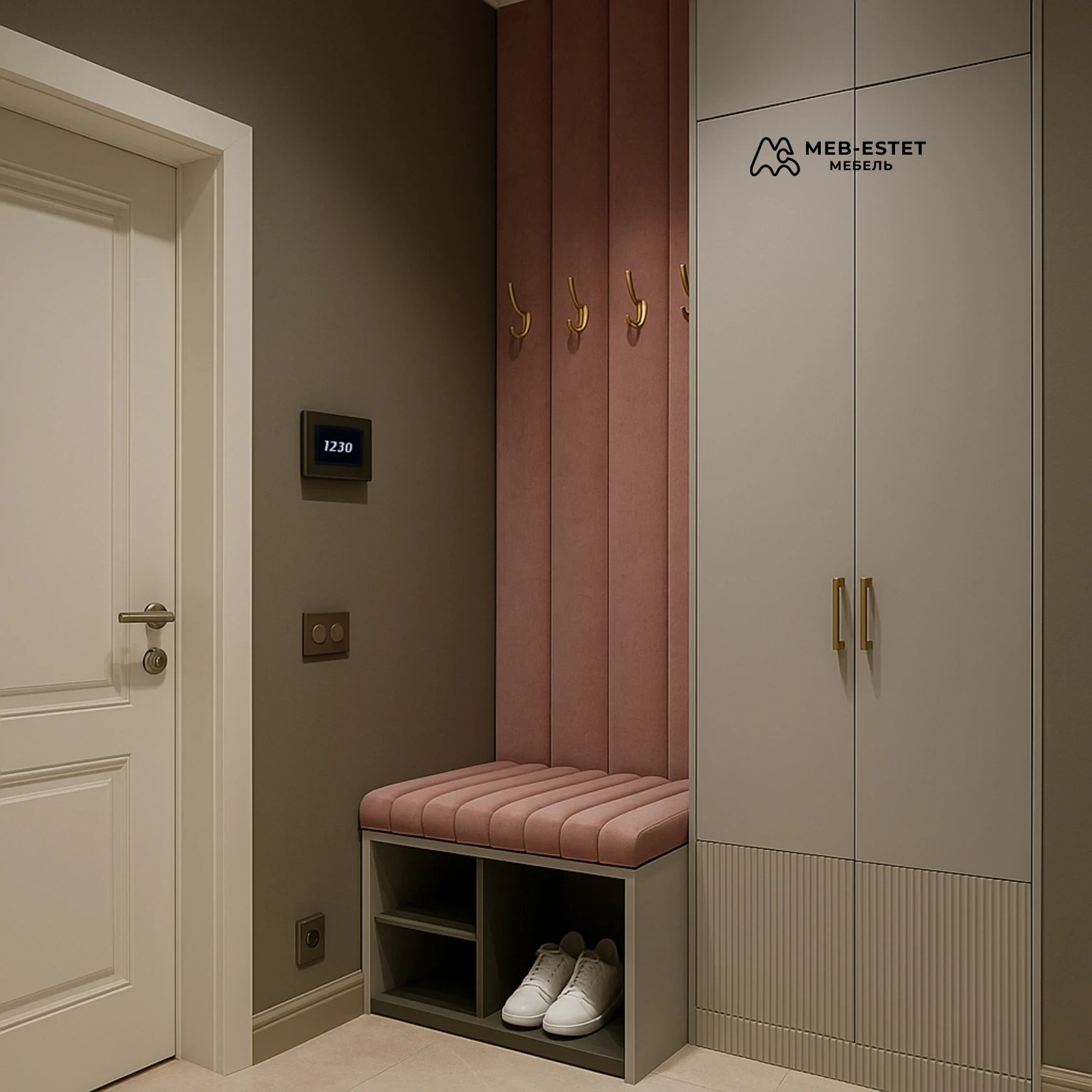 Встроенная прихожая премиум-класса: высокий шкаф-пенал с рифлёной нижней вставкой и удобная мягкая скамья с вертикальной стёжкой. Материалы — качественная МДФ/ЛДСП, мягкая обивка в пудровом тоне и латунные крючки.