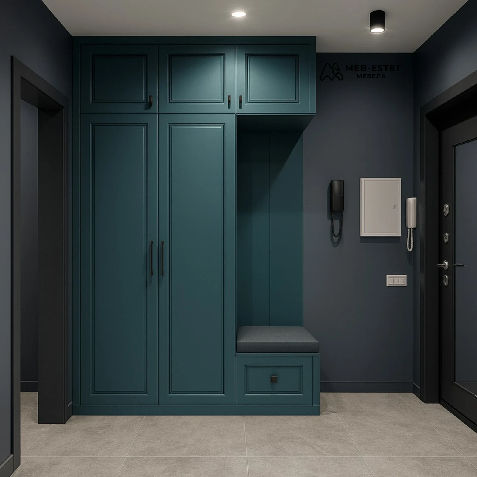 Комплект для прихожей премиум-класса: высокий шкаф с фрезерованными фасадами и встроенной нишей с мягким сиденьем. Выполнен из МДФ с эмалевой покраской, фурнитура тёмного цвета обеспечивает долговечность и эстетику.