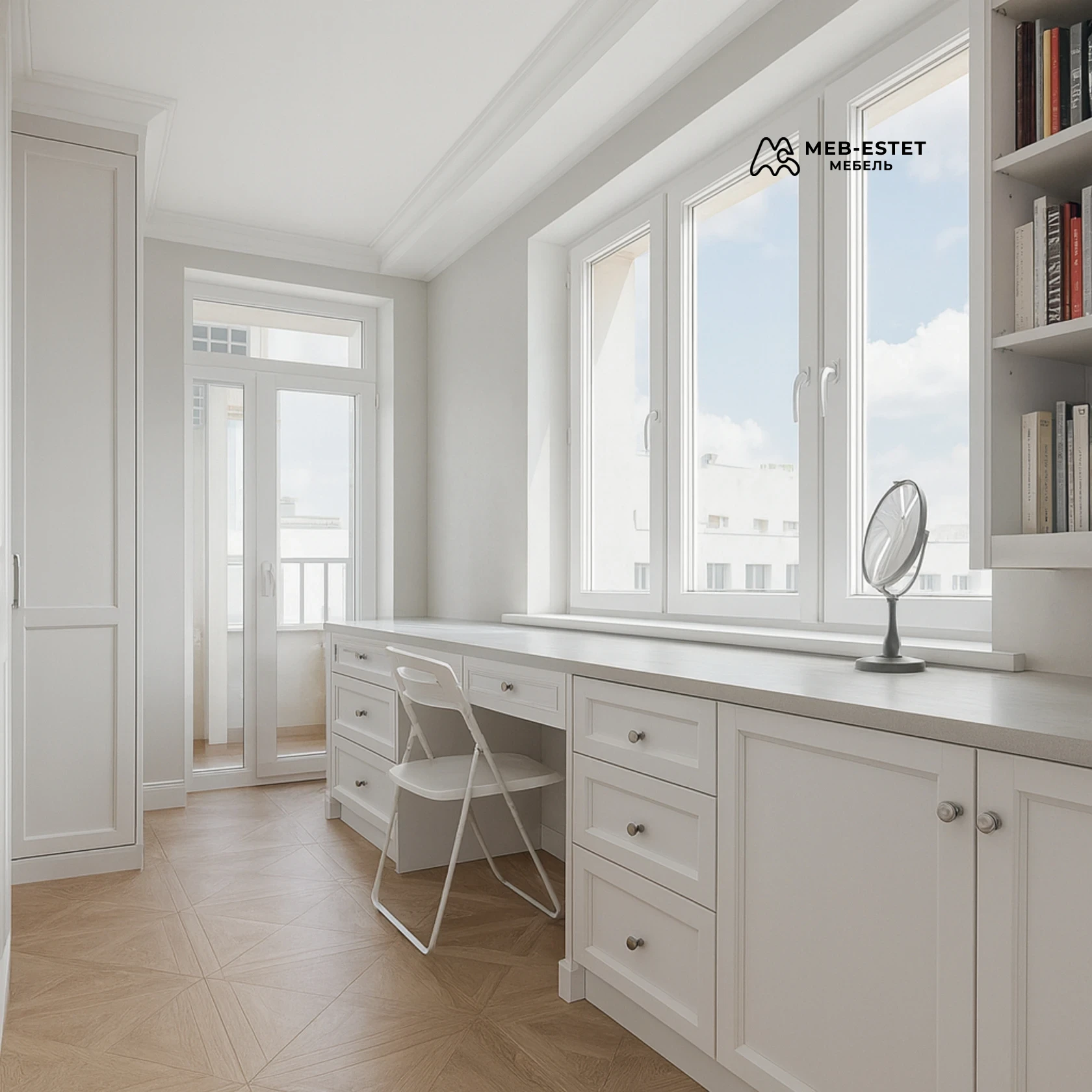 Встроенная рабочая зона на балконе — функциональное решение для компактного пространства. Выполнена в светлой палитре с филёнчатыми фасадами, плавными линиями и удобной системой выдвижных ящиков.