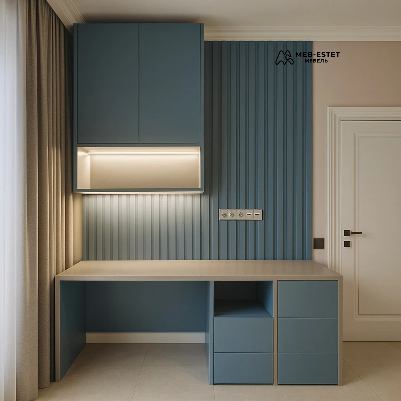 Компактная рабочая зона с навесным шкафом и тумбой, выполненная из МДФ с матовой поверхностью в сине‑бежевой гамме. Чёткие минималистичные фасады без видимых ручек и интегрированная подсветка создают аккуратный функциональный модуль для кабинета или гостиной.