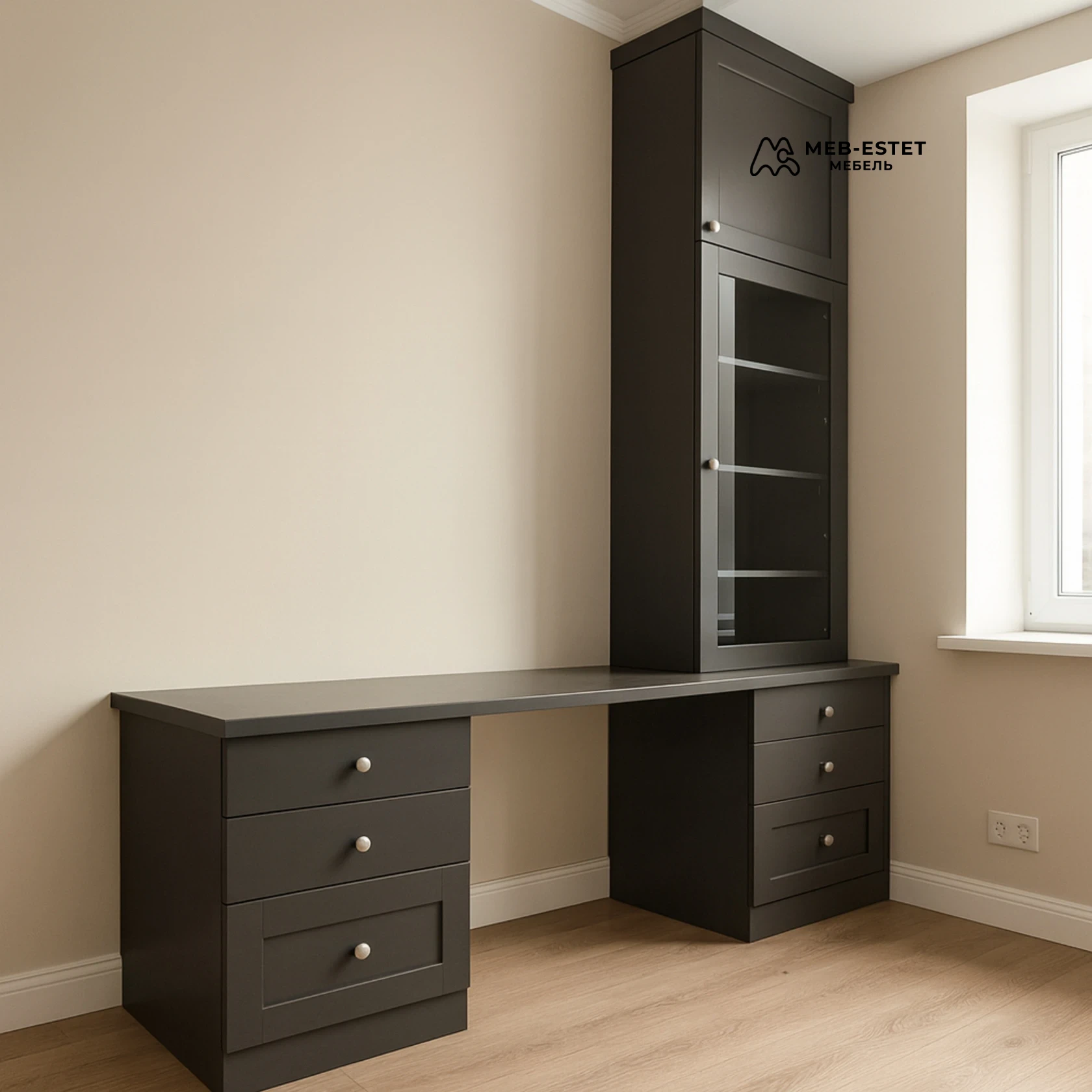 Корпусная рабочая зона премиум-класса: стол с двумя тумбами и высокий пенал со стеклянной дверцей. Продуманная конструкция — удобная ниша для ног, выдвижные ящики и регулируемые полки в пенале.