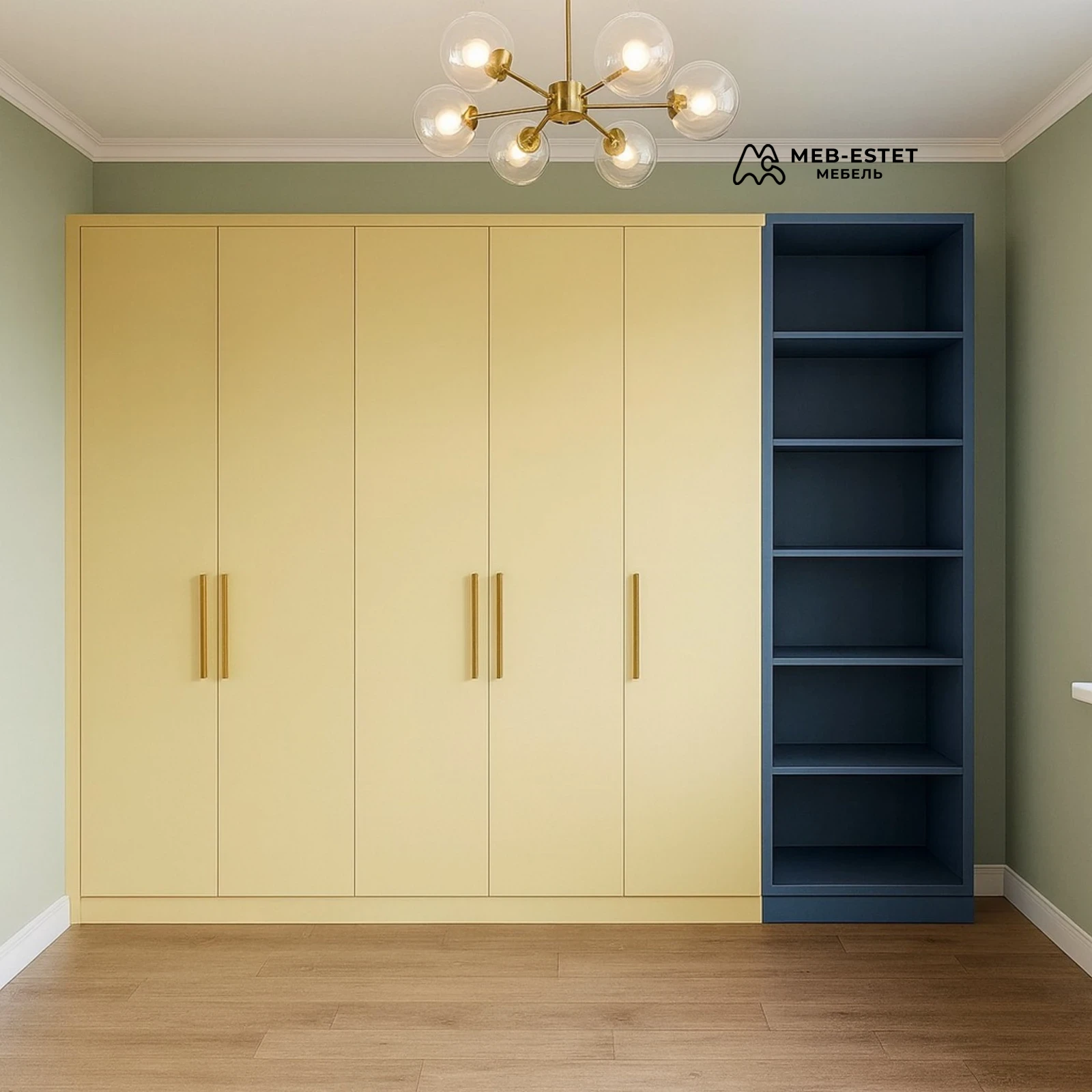 Элегантный распашной шкаф с открытым стеллажом в контрастном цвете. Корпус выполнен под встроенный монтаж, фасады — гладкий МДФ с матовой поверхностью. Длинные вертикальные ручки металлик подчеркивают премиальный образ и удобство использования.