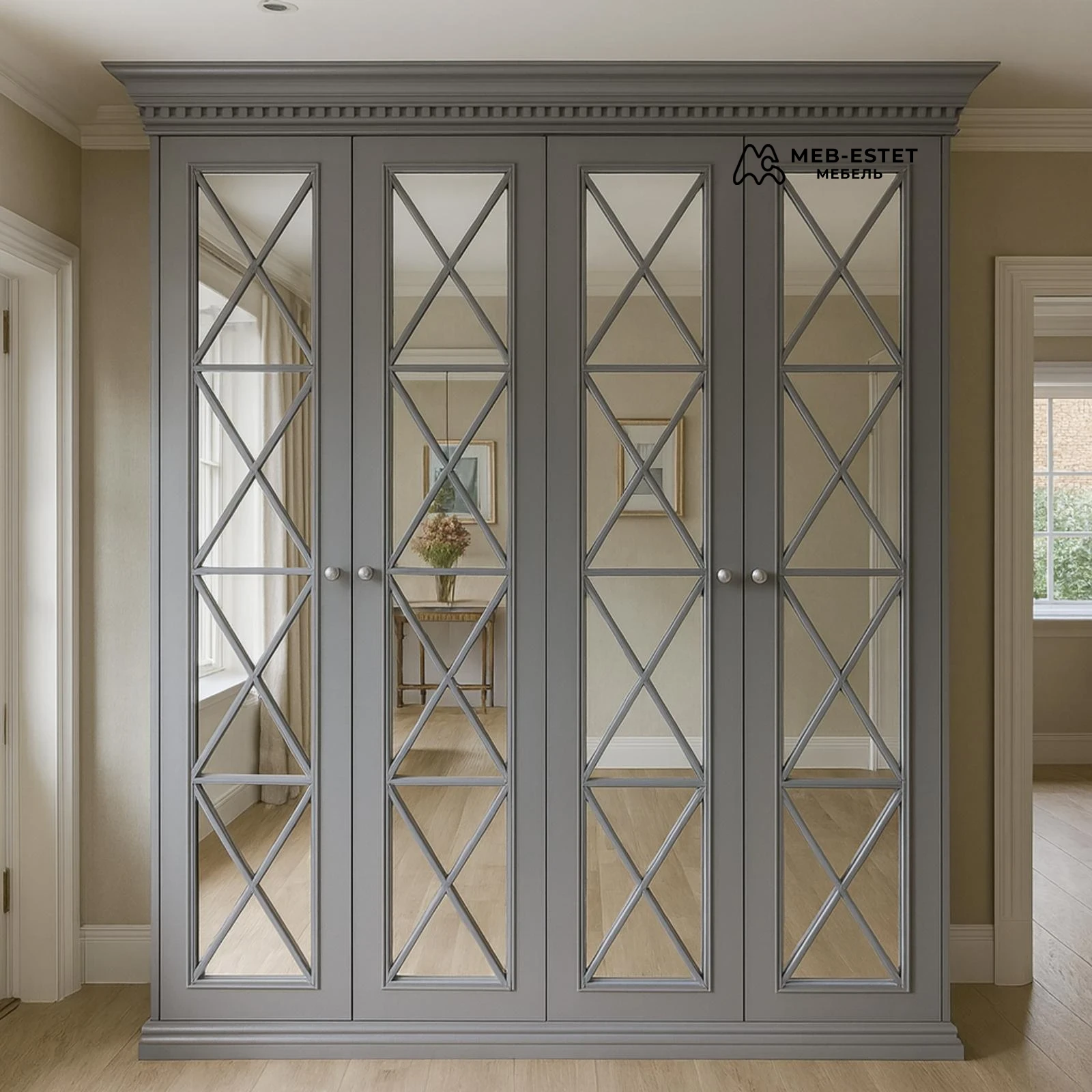 Элегантный распашной шкаф в неоклассическом стиле. Корпус и резной карниз выполнены из МДФ, фасады с зеркальными вставками и декоративной раскладкой. Корпусная конструкция обеспечивает жёсткость и долговечность, возможна комплектация полками, выдвижными ящиками и подсветкой.