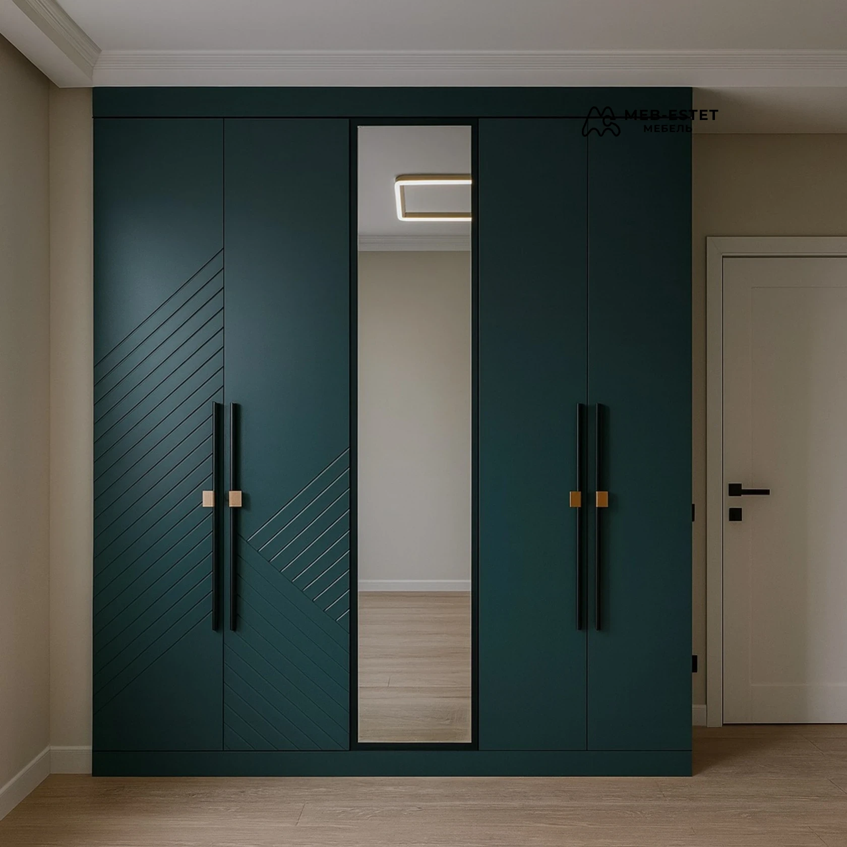 Элегантный распашной шкаф премиум-класса с центральным зеркалом и аккуратной фрезеровкой на фасадах. Изготовлен на заказ в соответствии с размерами помещения, корпус из крашеного МДФ с матовой эмалью, зеркальная вставка увеличивает пространство и удобна для примерки.