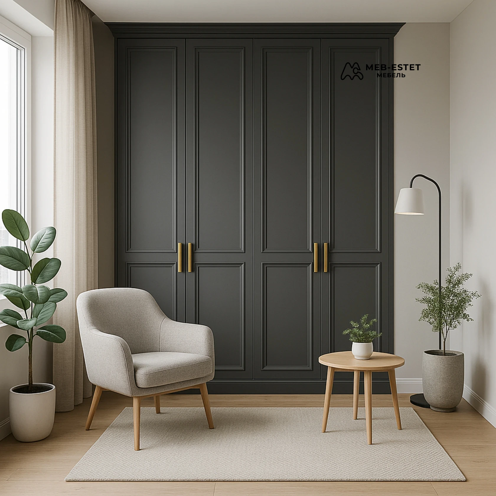 Встроенный распашной шкаф в неоклассическом стиле с филёнчатыми фасадами и матовой графитовой отделкой. Латунные вертикальные ручки подчёркивают премиальный характер изделия.