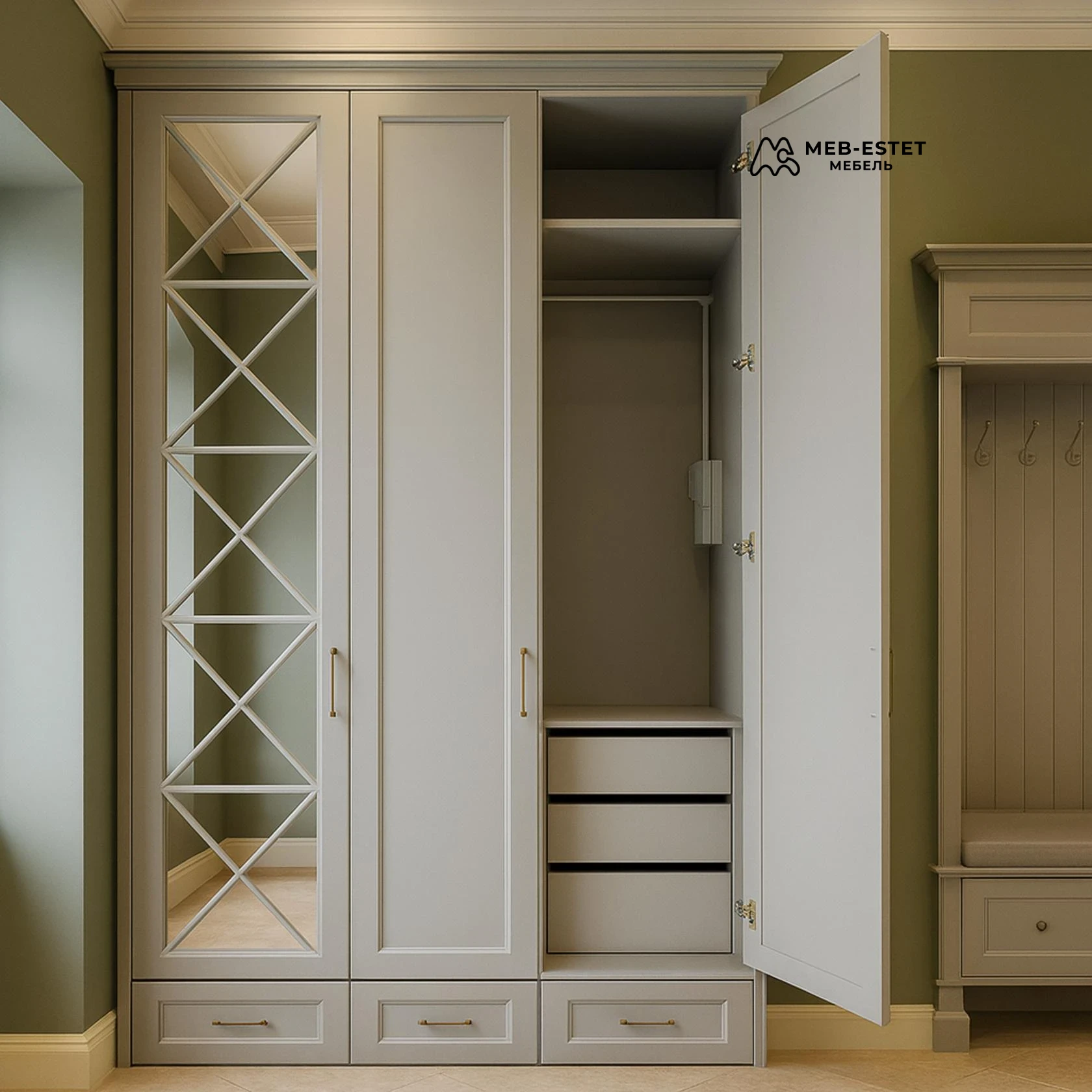 Классический распашной шкаф премиум-класса, выполнен на заказ. Визуально: одна створка с декоративной зеркальной решёткой, центральная филёрованная дверь и открытая секция с выдвижными ящиками. Корона доведена до потолка для интеграции в интерьер.