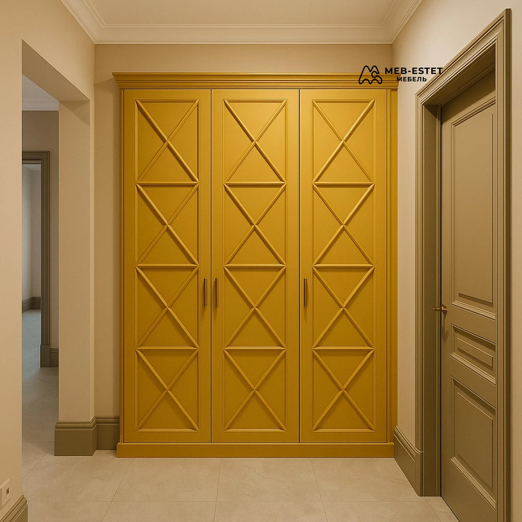 Элегантный распашной шкаф премиум-класса, выполненный в насыщенном жёлтом цвете. Корпус и фасады — крашеная МДФ с фрезерованным геометрическим рисунком, аккуратная корона и цоколь подчёркивают классическую стилистику.