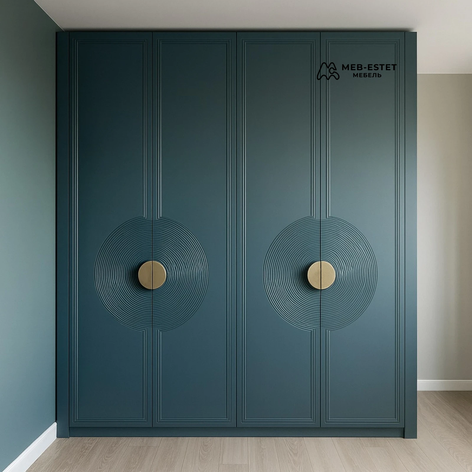 Элегантный распашной шкаф премиум-класса с фрезерованными фасадами и крупными круглыми латунными ручками. Корпус и фасады выполнены из МДФ с эмалевым матовым покрытием, фрезеровка формирует выразительный декор без лишней вычурности.