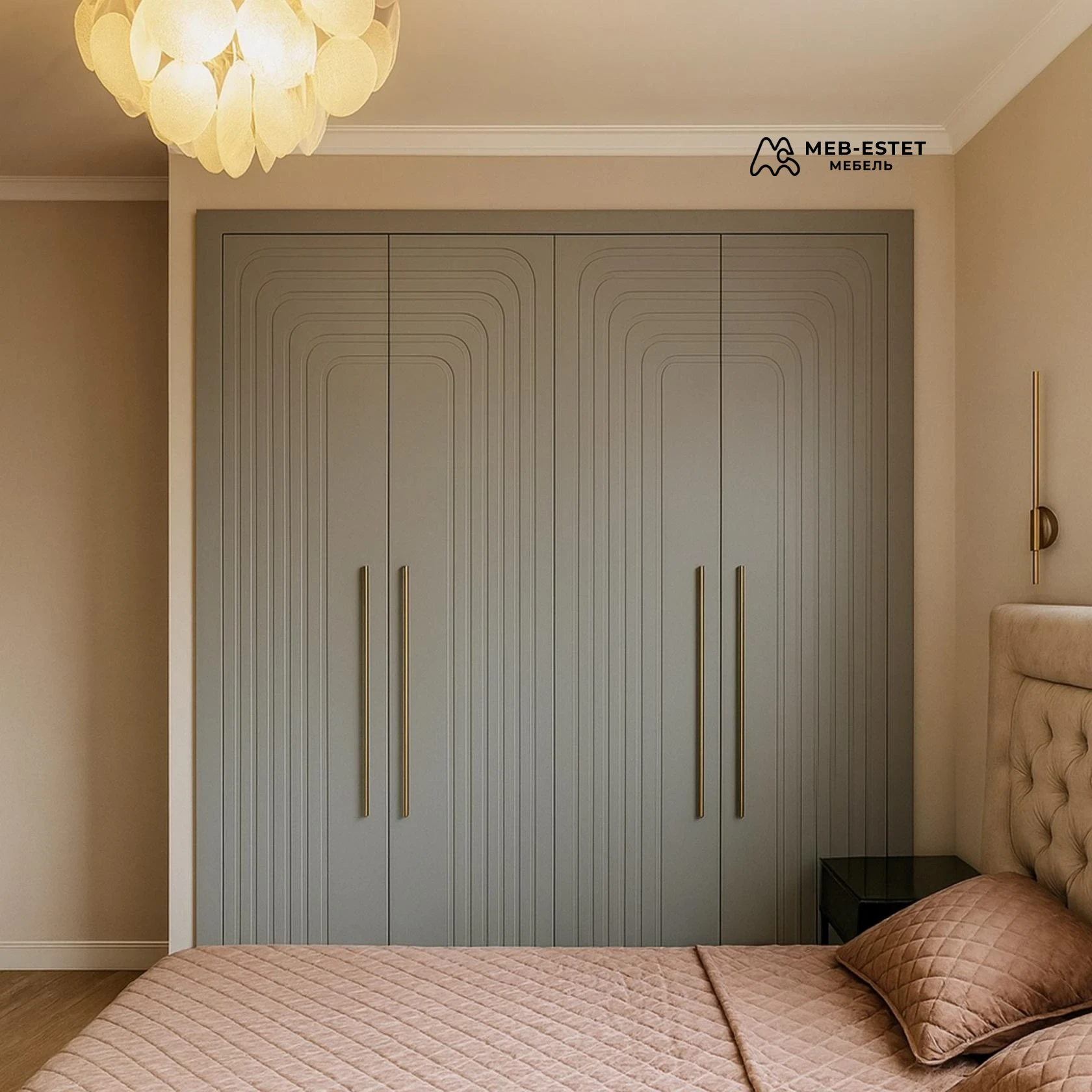 Элегантный встроенный распашной шкаф под потолок, выполненный с акцентом на премиальное исполнение. Фасады из МДФ с тонкой фрезеровкой создают ритмичный декоративный узор, матовая окраска серого тона гармонирует с латунными длинными ручками.