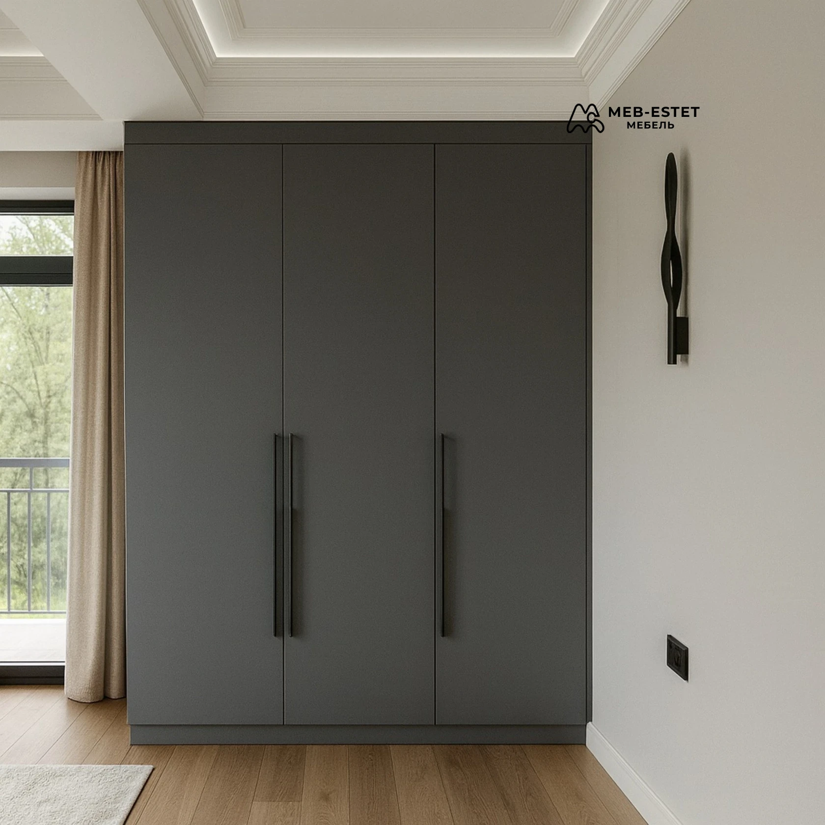 Трёхдверный распашной шкаф в тёмно-сером матовом исполнении — решение для тех, кто ценит лаконичный премиум-дизайн и функциональность. Корпус из МДФ, ровные скрытые швы и удлинённые вертикальные ручки подчёркивают строгий стиль.