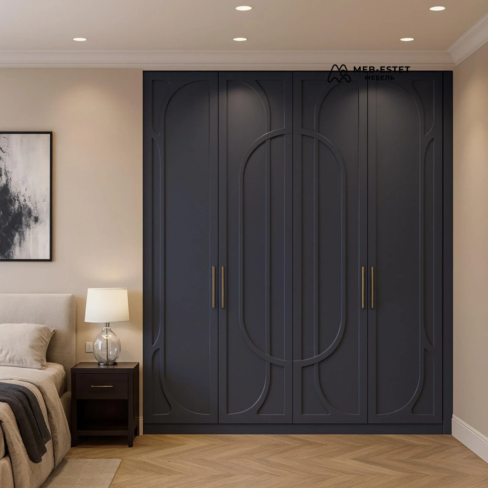 Распашной встроенный шкаф до потолка в неоклассическом стиле: глубокий матовый синий фасад с фрезерованным декором и латунными ручками. Компактный и элегантный, подходит для классической и современной спальни.