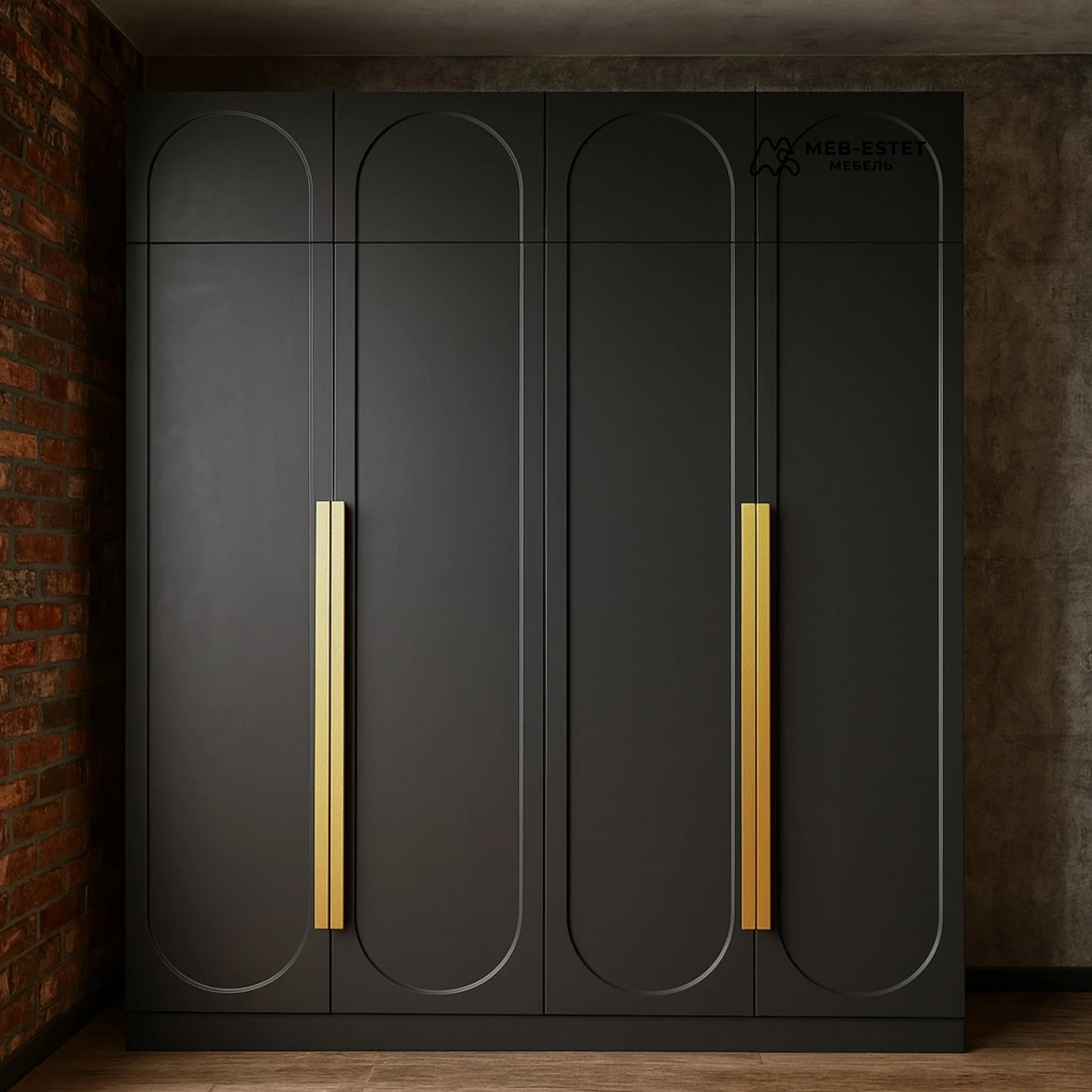 Элегантный распашной шкаф премиум-класса, выполнен в матовом чёрном оттенке с декоративной фрезеровкой в виде арочных панелей. Высокие вертикальные ручки золотистого цвета подчёркивают стройность фасада и придают интерьеру благородный акцент.