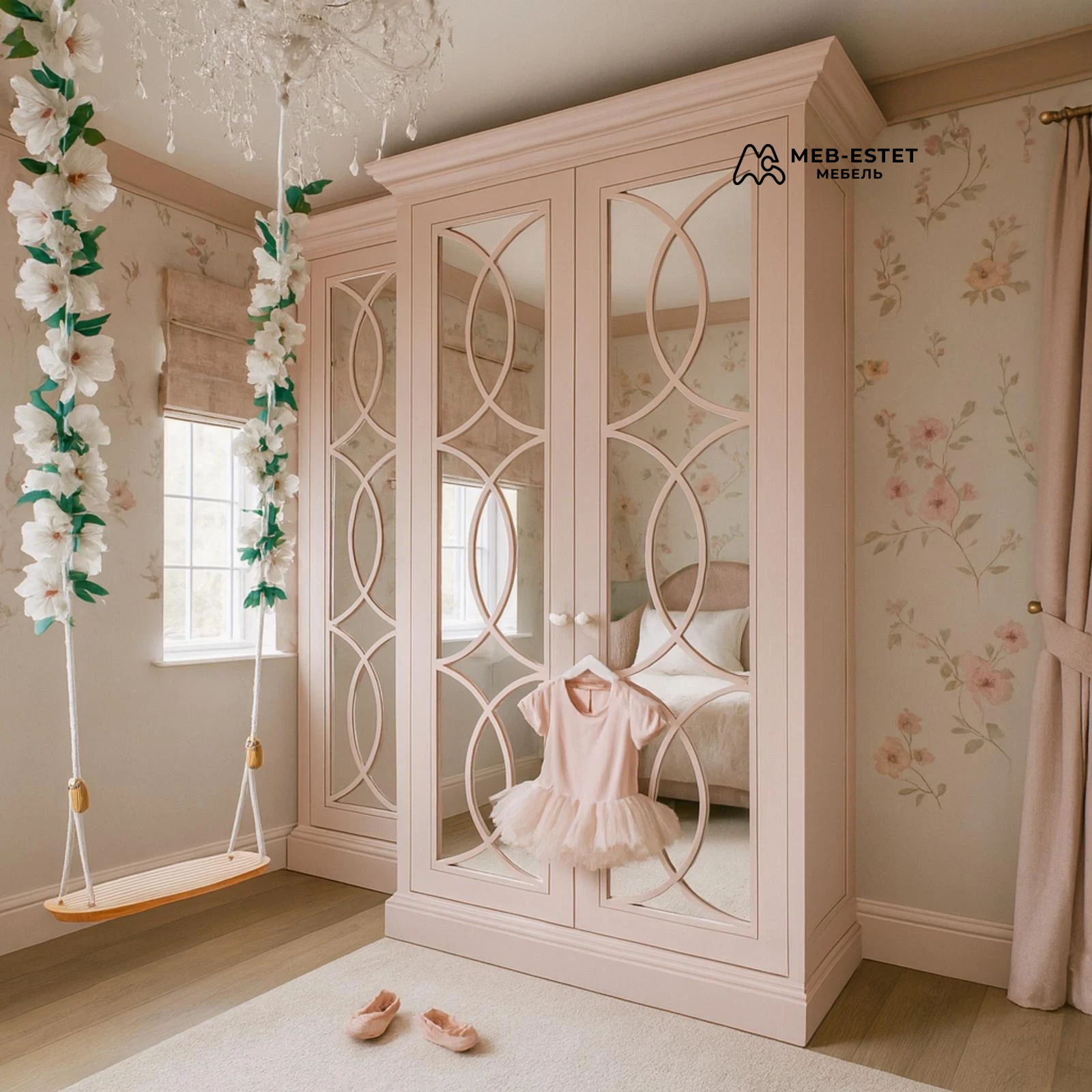 Элегантный корпусный шкаф для детской комнаты в нежно-розовой палитре. Фасады с зеркалами и фрезерованной декоративной раскладкой создают лёгкий классический образ и визуально увеличивают пространство.