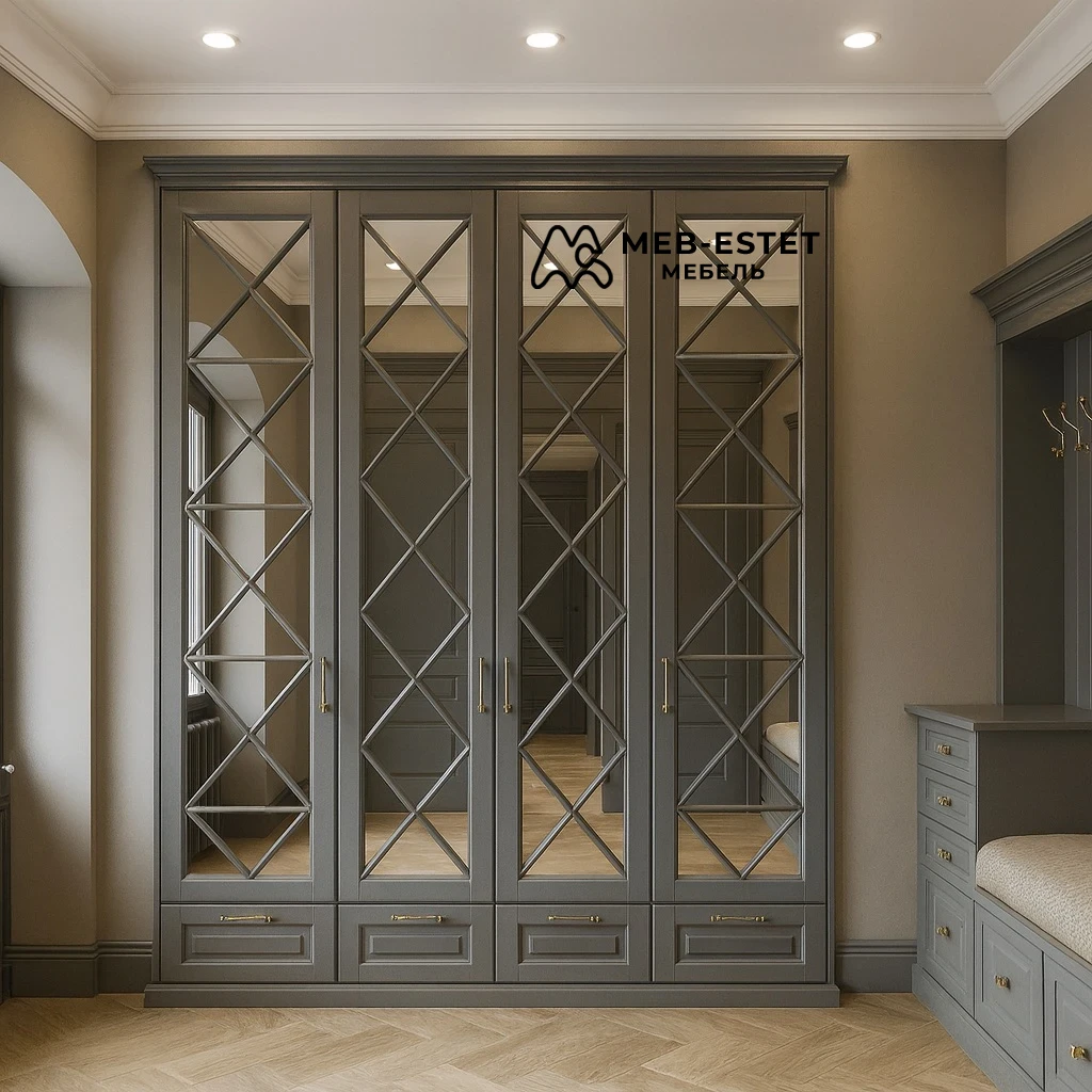Элегантный встроенный шкаф для прихожей в неоклассическом стиле. Массивный каркас и филёнчатые нижние ящики сочетаются с зеркальными распашными дверями и декоративной раскладкой. Идеален для хранения верхней одежды, обуви и аксессуаров при сохранении визуальной лёгкости за счёт зеркал.