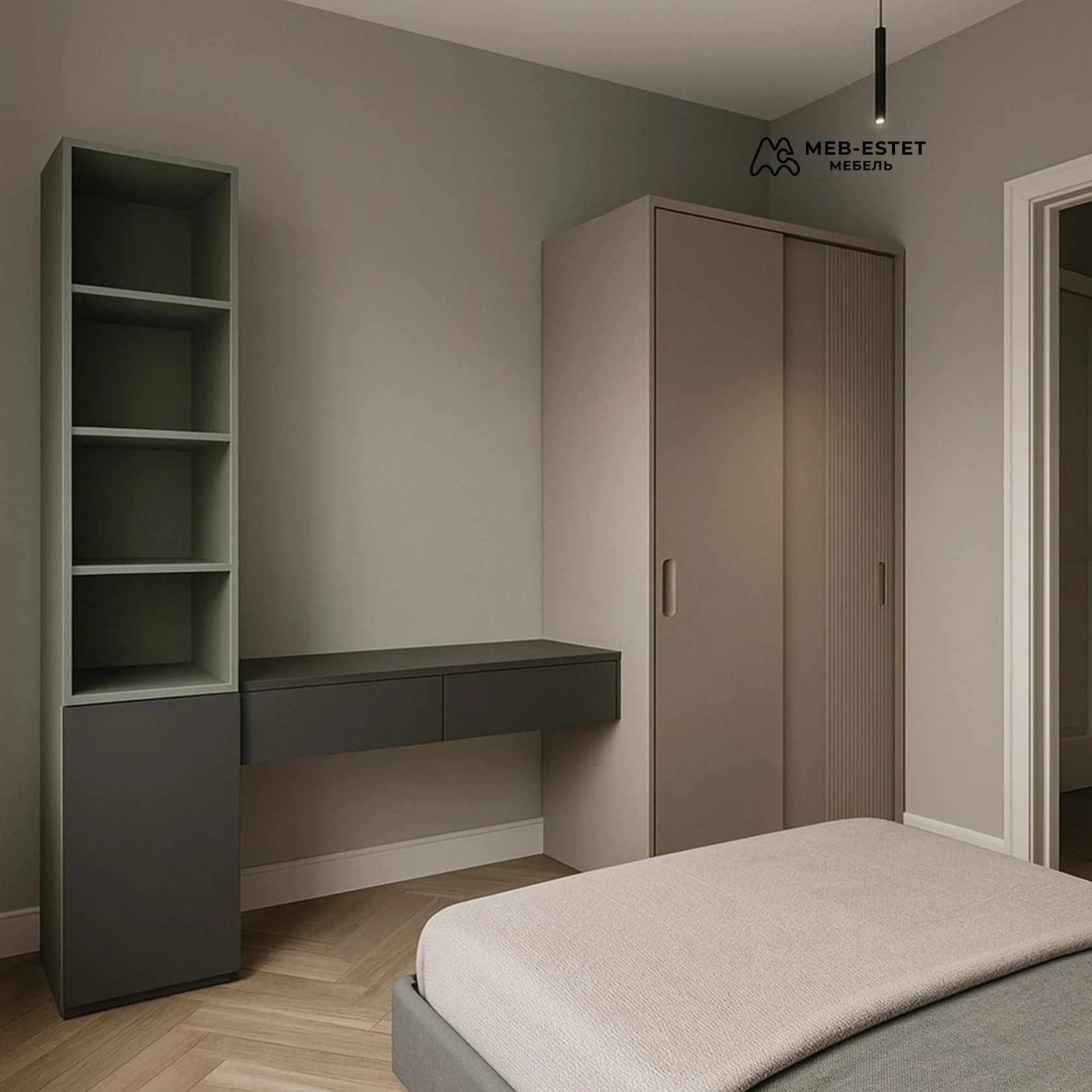 Компактная мебельная композиция для спальни: шкаф-купе с рифлёной фасадной секцией и встроенной рабочей зоной с боковым стеллажом. Выполнена в премиальных материалах — каркас из ЛДСП, фасады из МДФ с матовой поверхностью и реечной текстурой.