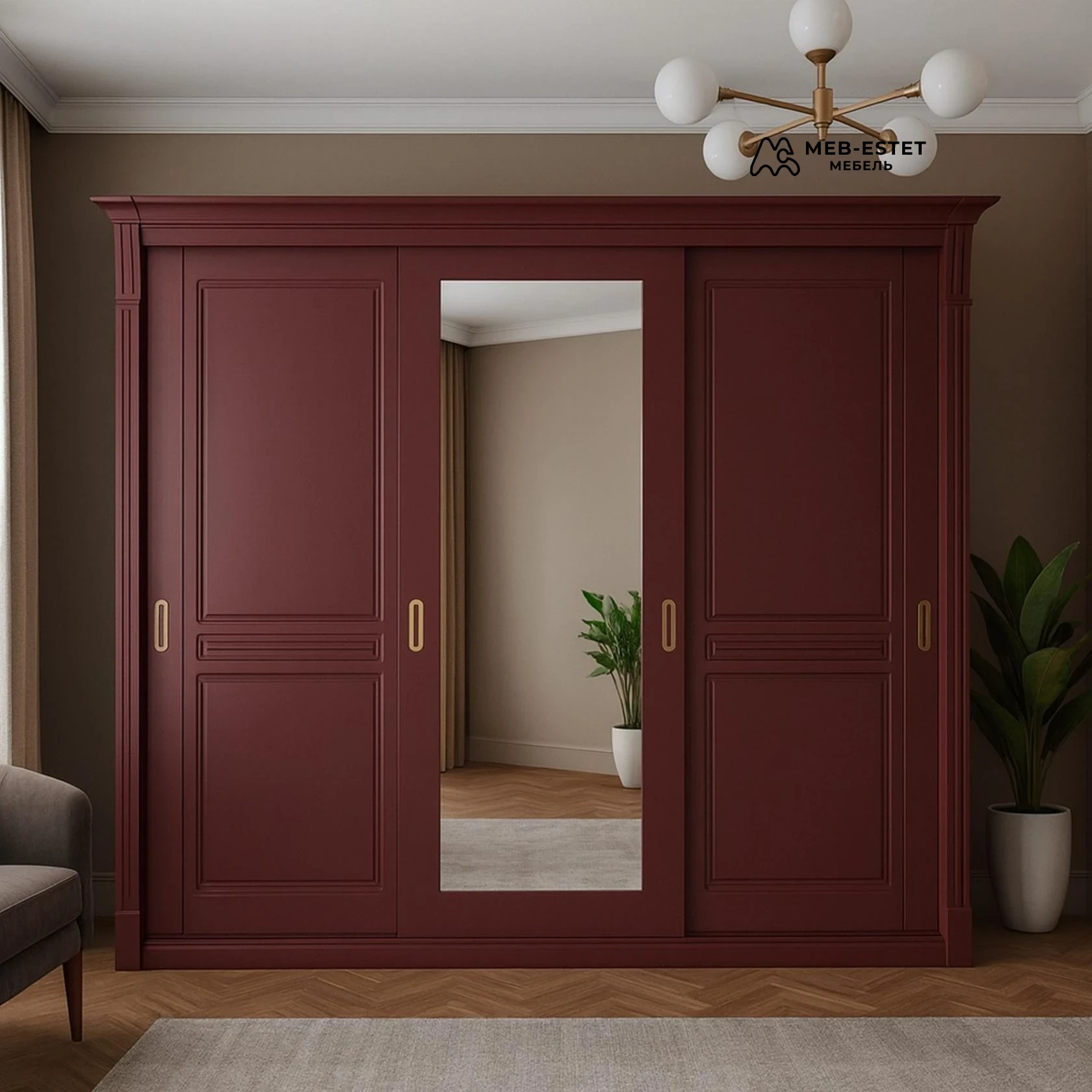 Элегантный шкаф-купе в неоклассическом стиле, выполнен на заказ из МДФ с эмалевым матовым покрытием. Центральная раздвижная дверь со встроенным зеркалом визуально расширяет пространство, боковые панели декорированы филёнками и пилястрами, верхний карниз подчёркивает классические пропорции.