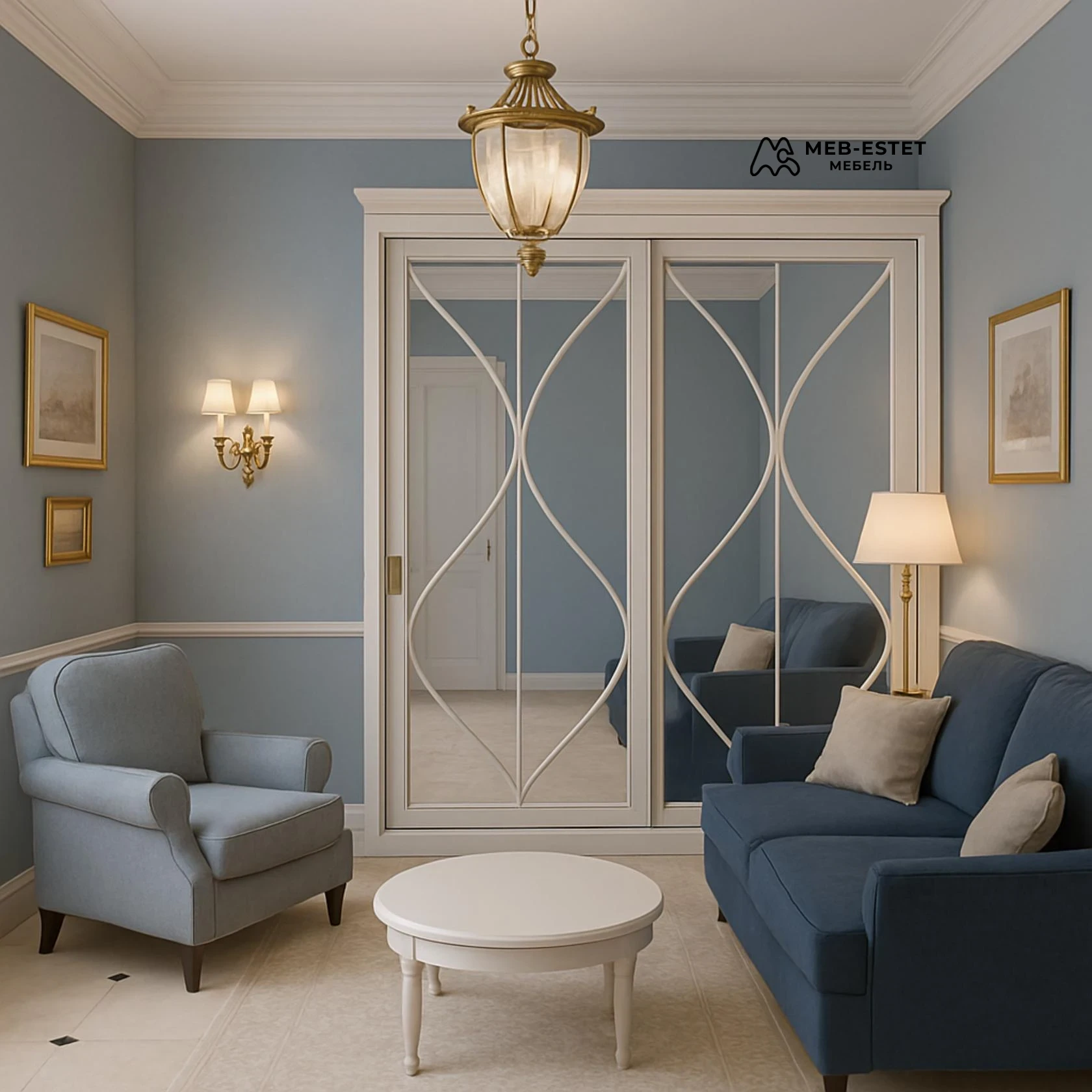 Дизайнерское решение — встроенный шкаф-купе премиум-класса с зеркальными раздвижными дверями и декоративным перекрестным декором. Подчёркнутый неоклассический профиль и молдинг сверху вписываются в классическую гостиную с мягкой цветовой гаммой.