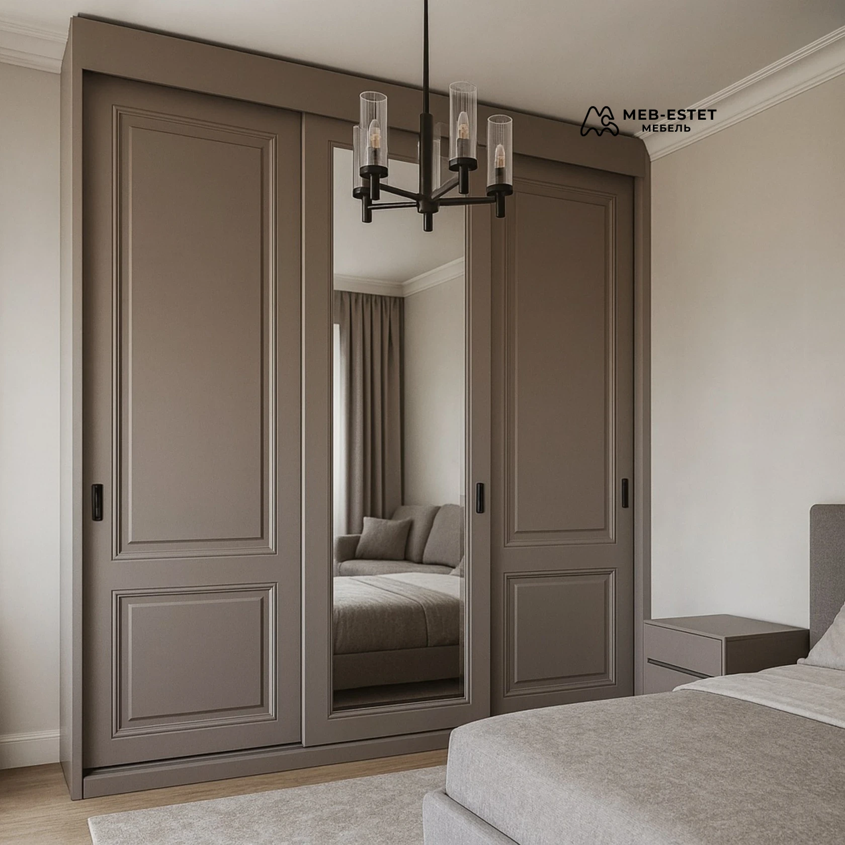 Элегантный встроенный шкаф-купе в неоклассическом стиле: три раздвижные двери с центральным зеркалом и фрезерованными панелями. Изготовлен на заказ из МДФ с эмалевым покрытием — ровная матовая поверхность, скрытые интегрированные ручки. Внутри: штанга для одежды, выдвижные ящики и регулируемые полки. Подходит для спальни, позволяет организовать гардероб на всю высоту помещения. Премиальная фурнитура, мягкие доводчики, индивидуальные размеры и исполнение под заказ.