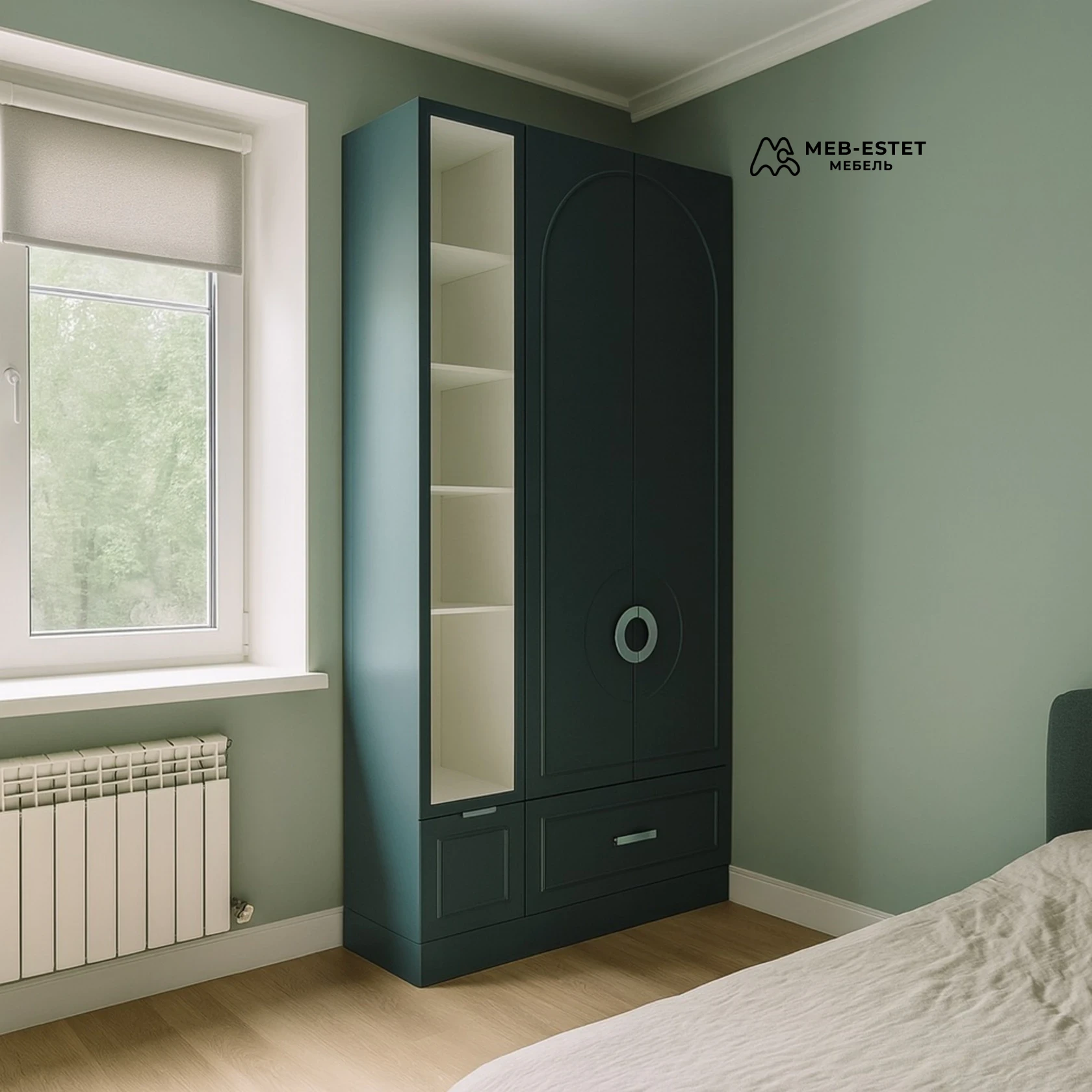 Корпусный распашной шкаф‑пенал в неоклассическом ключе. Корпус и фасады — окрашенный МДФ с матовой эмалью, декоративная фрезеровка на фасаде и круглый ручной элемент как акцент. Внутри открытые полки слева, спальничные полки и выдвижные ящики на направляющих полного выдвижения с мягким закрыванием.