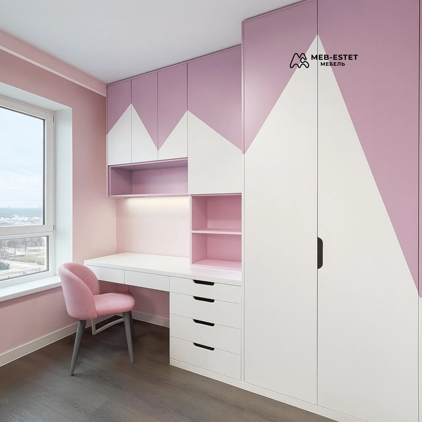 Комплексная встроенная мебель для детской: шкаф, рабочая столешница, выдвижные ящики и открытые полки. Идеально для организации учебного места и хранения одежды.