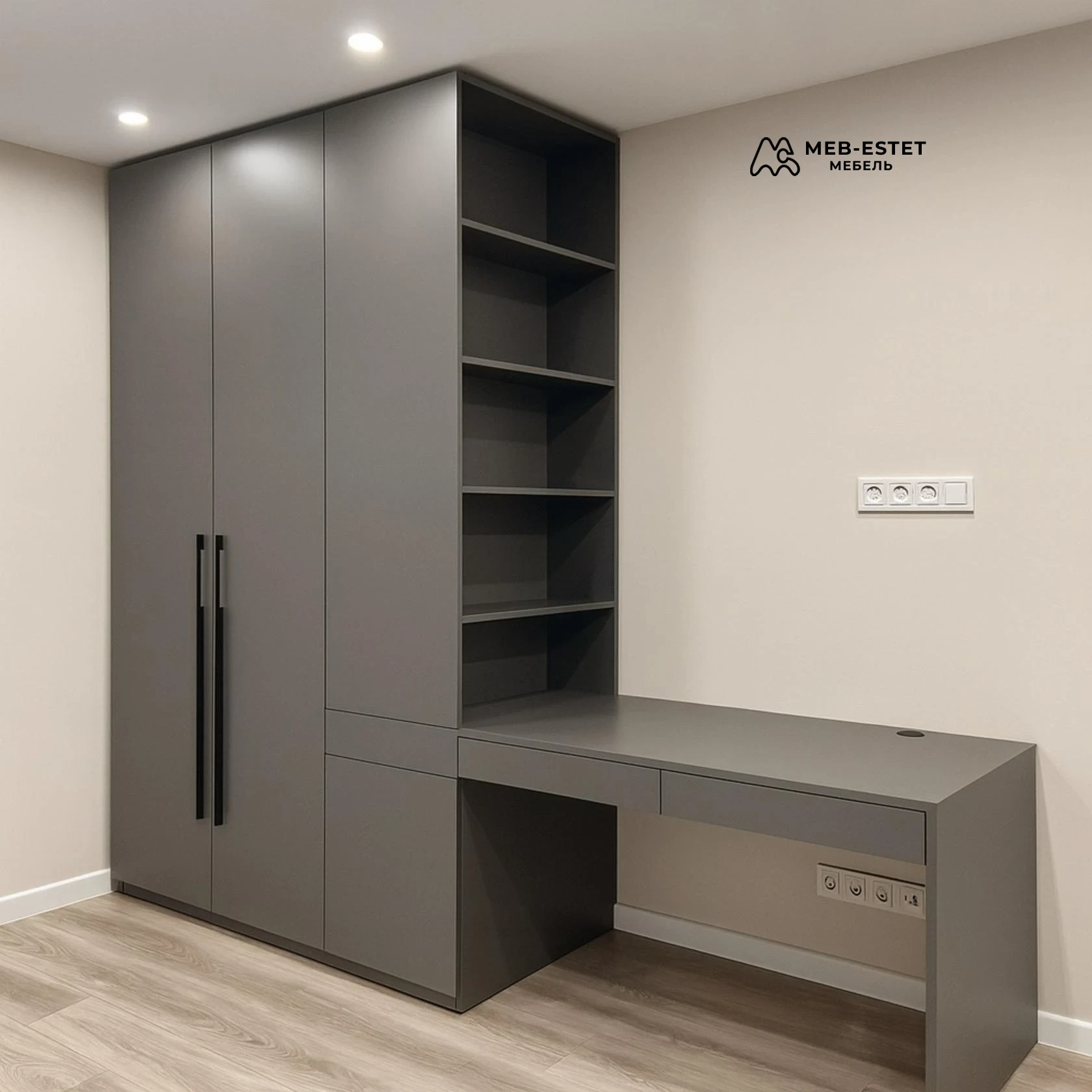 Компактный корпусный шкаф с интегрированной рабочей поверхностью и открытыми полками. Матовый серый фасад из МДФ и длинные чёрные ручки подчёркивают минималистичный стиль и премиальное исполнение.
