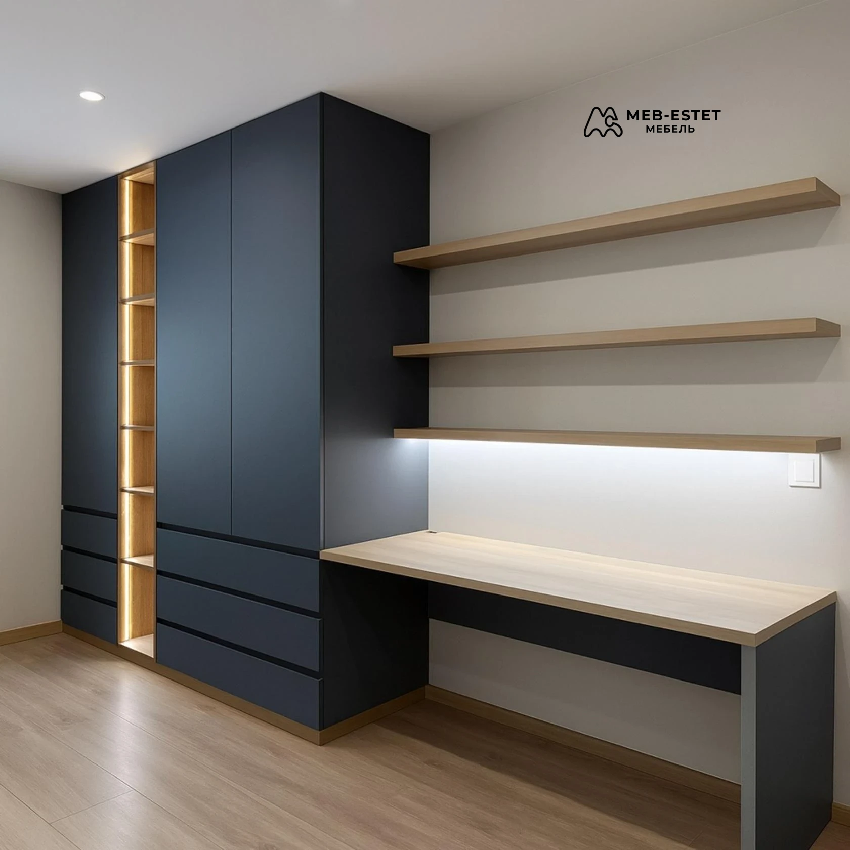 Современный модульный шкаф с интегрированной рабочей зоной — решение премиум-класса для кабинета или спальни. Корпус из матовой МДФ тёмно-синего оттенка сочетается с деревянными открытыми полками и подсветкой ниш. Функциональная конфигурация включает выдвижные ящики, глубокие фасады для одежды и просторный стол для работы.