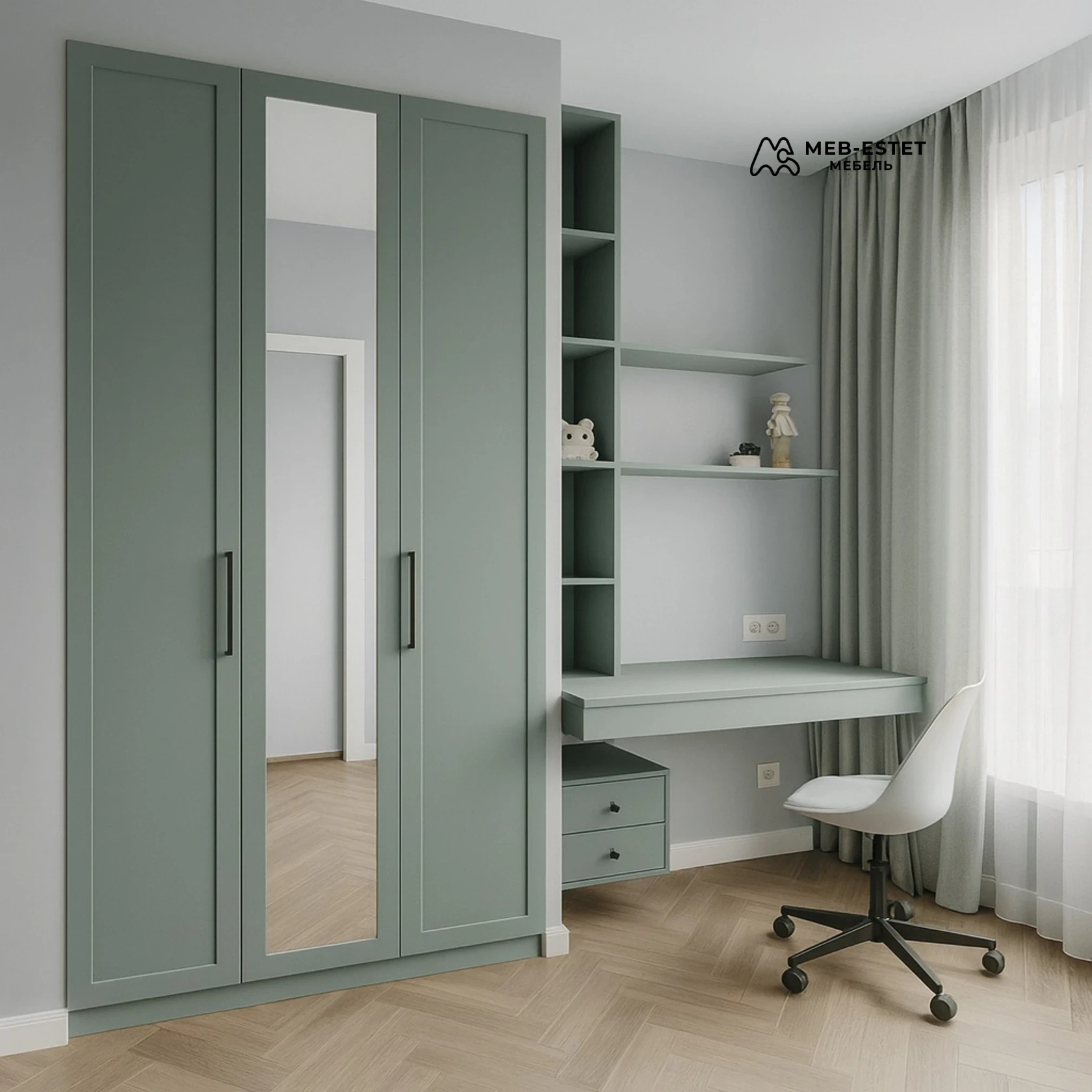 Компактный встроенный шкаф с интегрированной рабочей зоной — решение для кабинета или спальни. Фасады из крашеного МДФ с матовой поверхностью и фрезеровкой, центральная дверца со вставкой-зеркалом. Корпусная конструкция на регулируемых опорах, подвесной стол с выдвижным ящиком и открытыми полками для книг и декора.