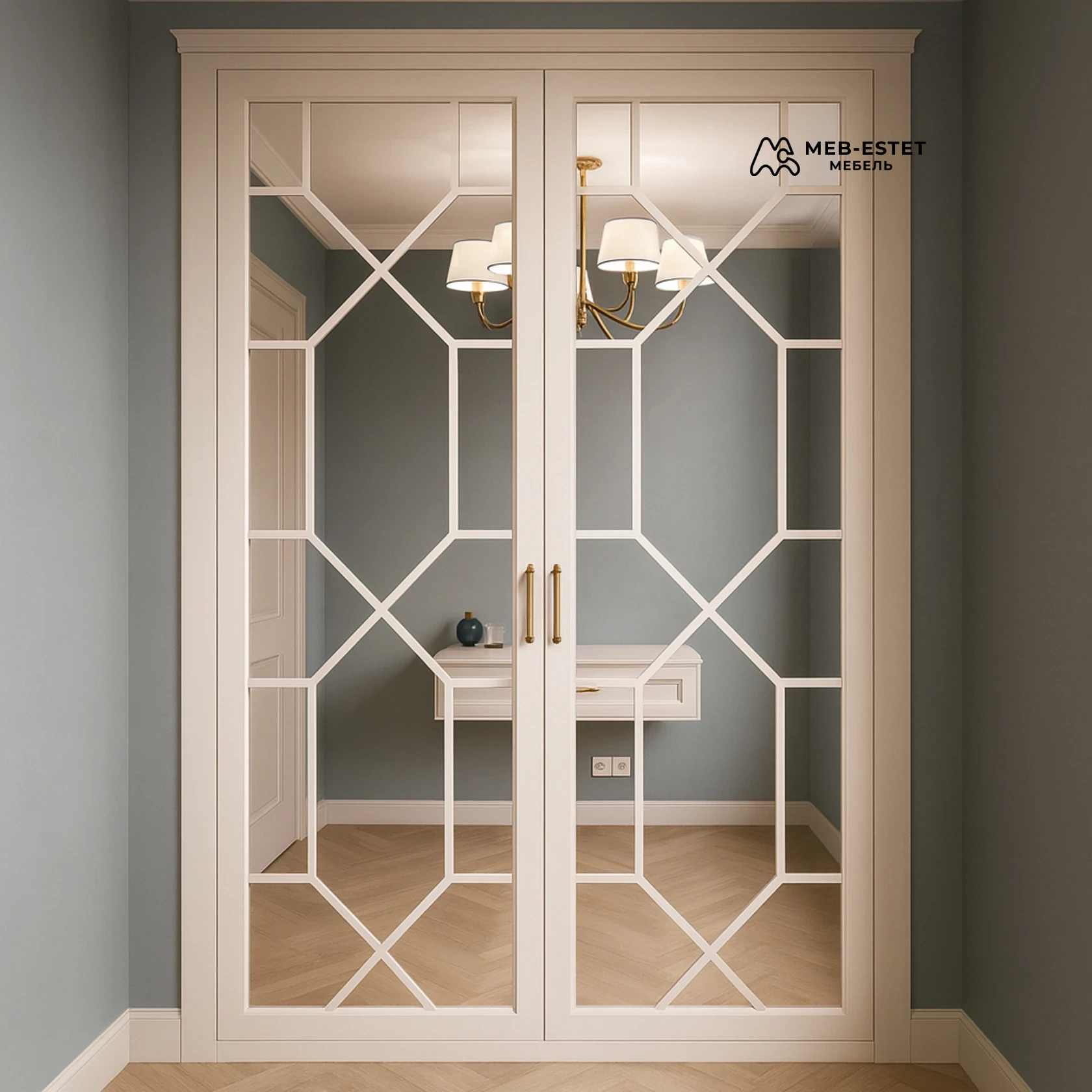 Элегантный двухдверный шкаф с зеркальными фасадами и декоративной геометрической раскладкой. Идеален для прихожей или спальни, выполнен в кремовом тоне с лаконичной карнизной отделкой.