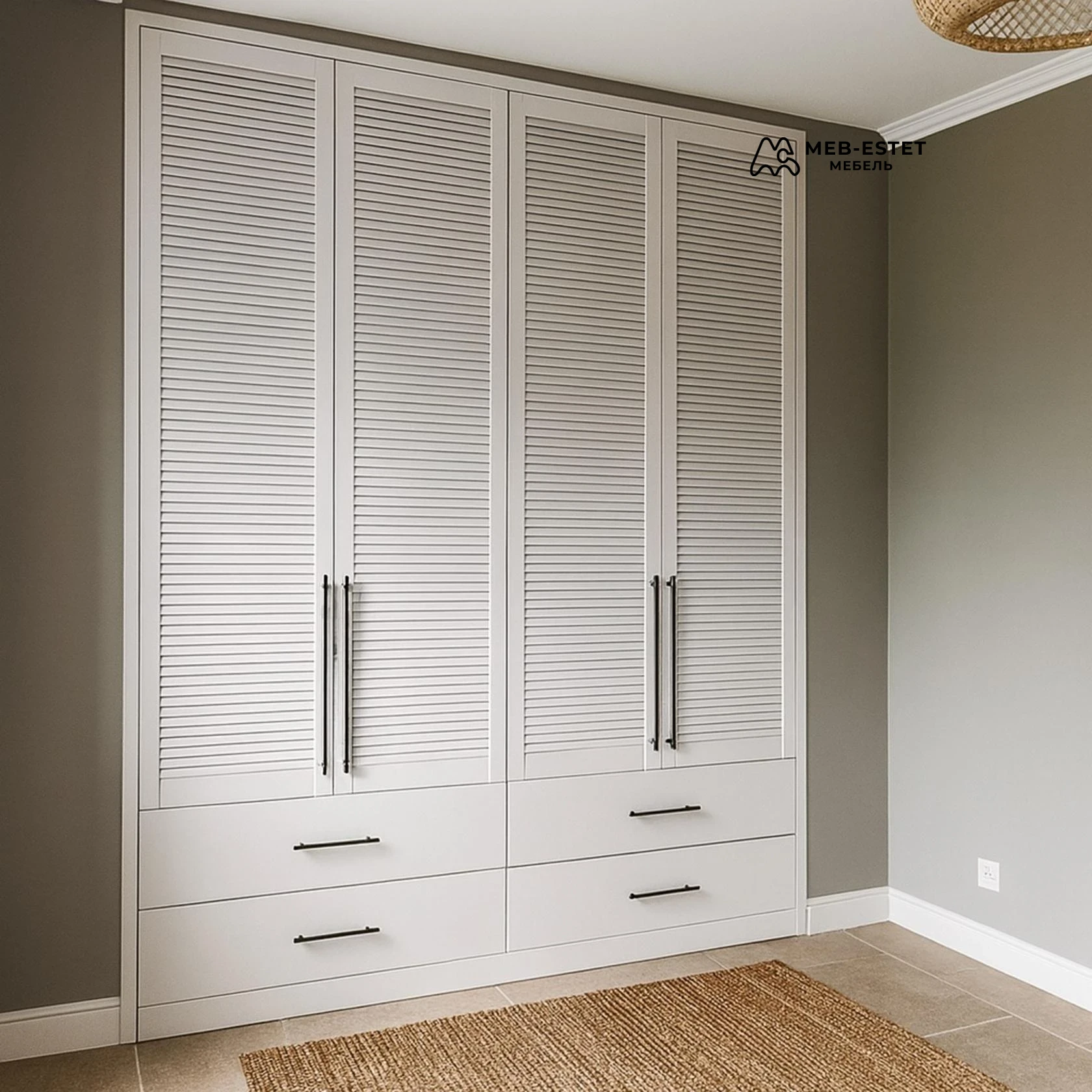 Элегантный встроенный платяной шкаф с жалюзийными фасадами — решение для тех, кто ценит чистые линии и качественную отделку. Фасады выполнены из МДФ с матовой краской в кремовом тоне, длинные металлические ручки подчеркивают вертикальную архитектуру.