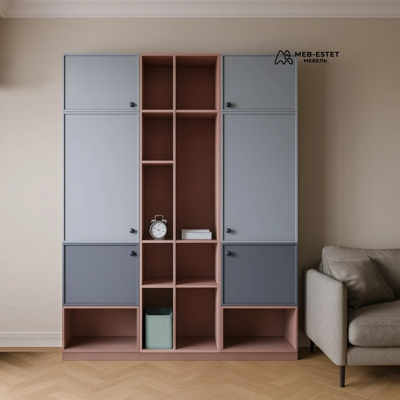 Модульная корпусная стенка с комбинированными секциями: закрытые фасады и открытые ниши для декора и книг. Продуманная геометрия створок и ниш обеспечивает удобную зональную организацию хранения.