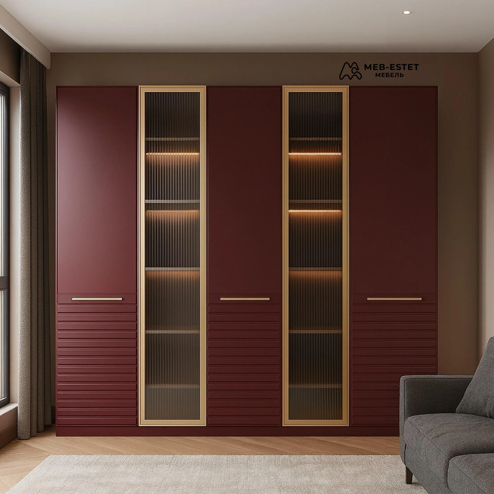Элегантная шкаф-стенка на заказ в премиальном исполнении. Корпус из МДФ с матовой окраской бордового тона, золотистый алюминиевый профиль и рифленое стекло витрин с интегрированной LED-подсветкой.