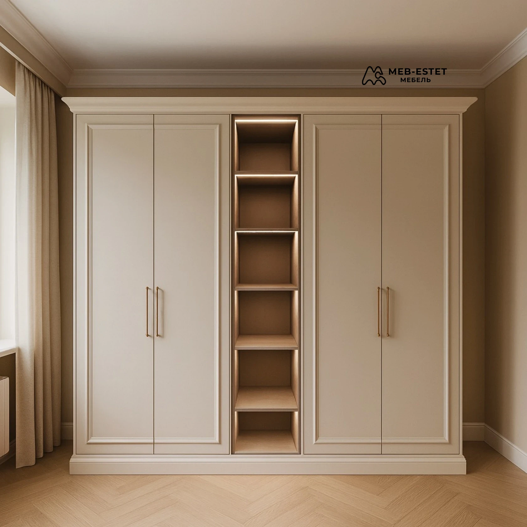 Классический корпусный шкаф в неоклассическом стиле: крашеный МДФ, декоративный карниз и цоколь, латунные ручки и открытый центральный стеллаж с интегрированной подсветкой. Дизайн сбалансирован для спальни и прихожей, акцент на аккуратных филенках и плавных линиях.