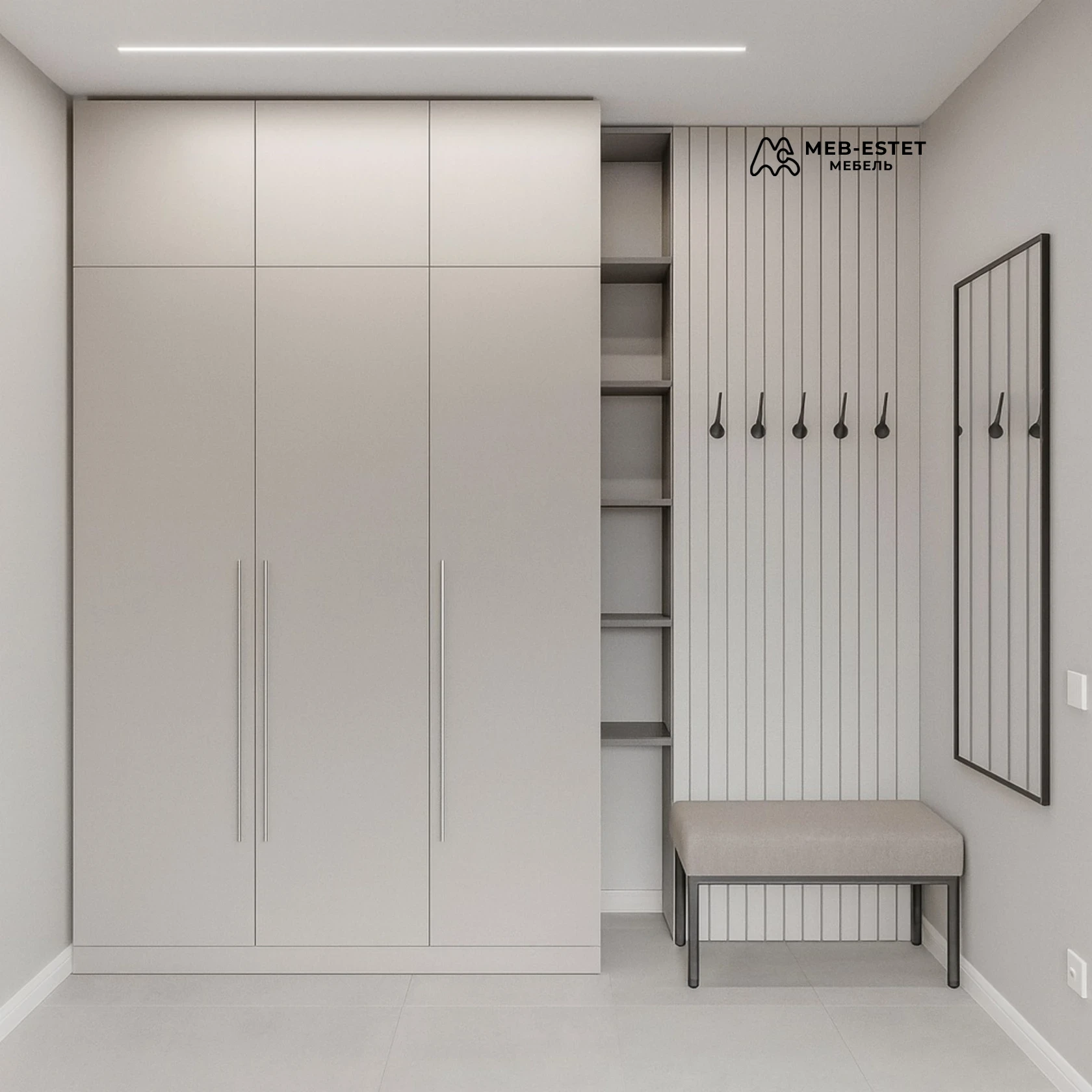 Шкаф-прихожая на заказ в спокойной бежевой палитре. Композиция включает высокий шкаф до потолка с тремя дверями, узкий открытый пенал, реечную панель с крючками и мягкую лавку.