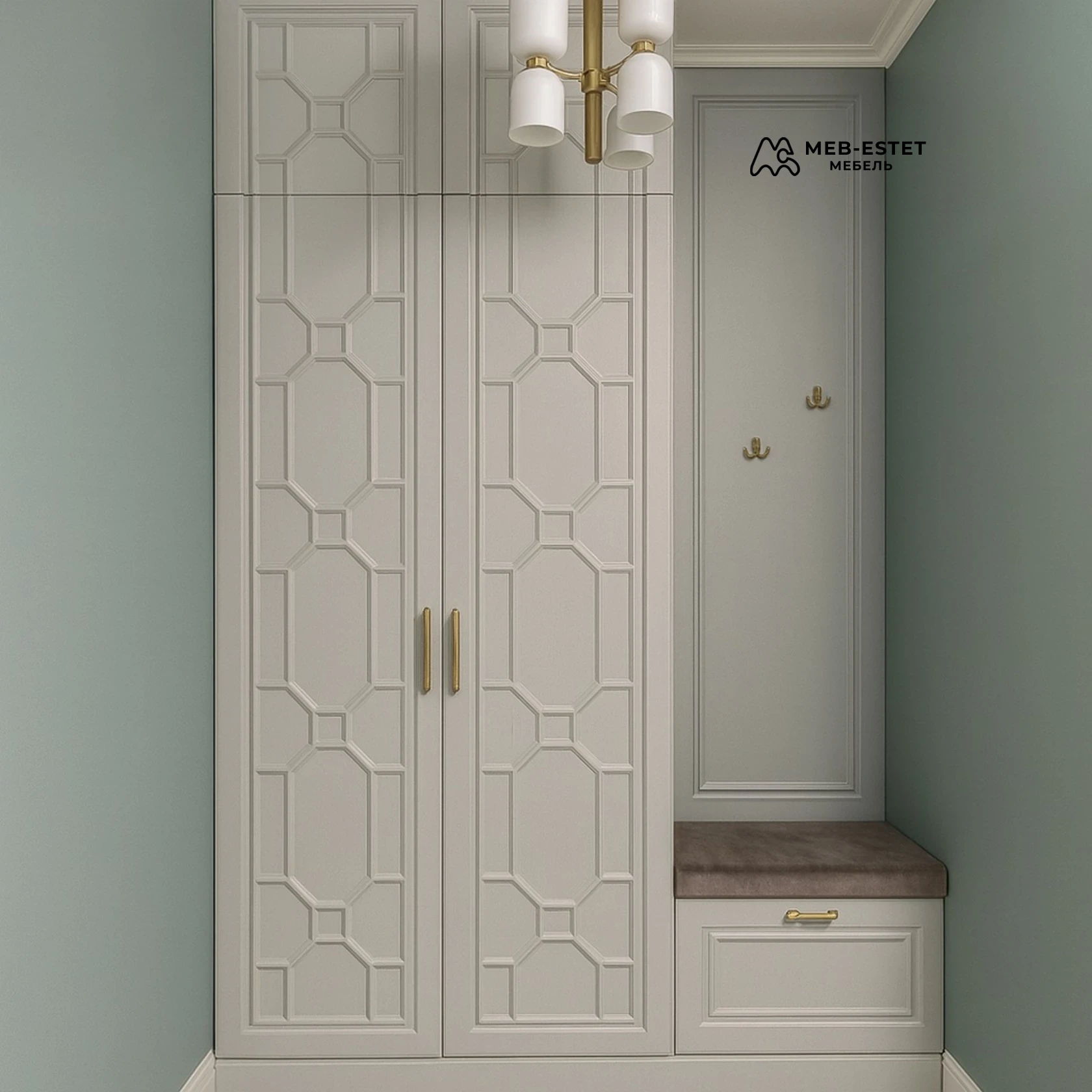 Строгая неоклассическая прихожая на заказ: высокие филёнчатые фасады из МДФ с фрезеровкой и матовой эмалевой отделкой, латунные ручки, встроенная банкетка с мягким сиденьем и выдвижным ящиком для обуви. Конструкция продумана для хранения верхней одежды и обуви — штанга, полки и ящик на направляющих полного выдвижения, петли с доводчиками.