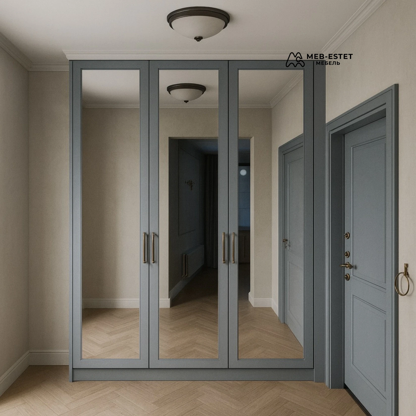 Элегантный шкаф для прихожей с четырьмя распашными дверями и крупными зеркальными вставками. Фасады — окрашенный МДФ с фрезерованной рамкой, матовая поверхность; зеркала увеличивают пространство и удобны при примерке верхней одежды. Вертикальные металлизированные ручки и скрытые петли с доводчиками обеспечивают плавность и надёжность.
