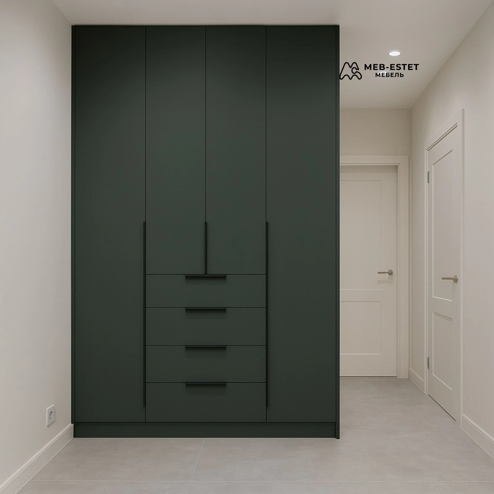Высокий корпусный шкаф для прихожей в матовой зелёной эмали. Дизайн — минималистичный: цельные фасады без декора, контрастные вытянутые чёрные ручки и центральный блок из выдвижных ящиков. Конструкция вплотную до потолка, что увеличивает полезный объём и выглядит аккуратно в узком коридоре.