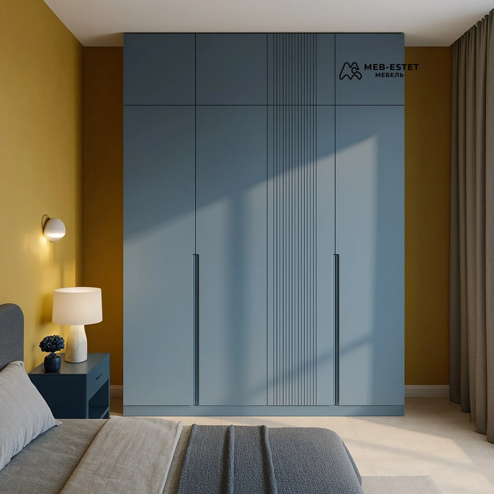 Современный корпусный шкаф-платяной на заказ, выполнен в глубоком синем цвете с матовой эмалью на МДФ. Вертикальные фрезерованные рейки на центральной створке придают рельеф и визуальную лёгкость. Интегрированные тонкие ручки подчёркивают минимализм.