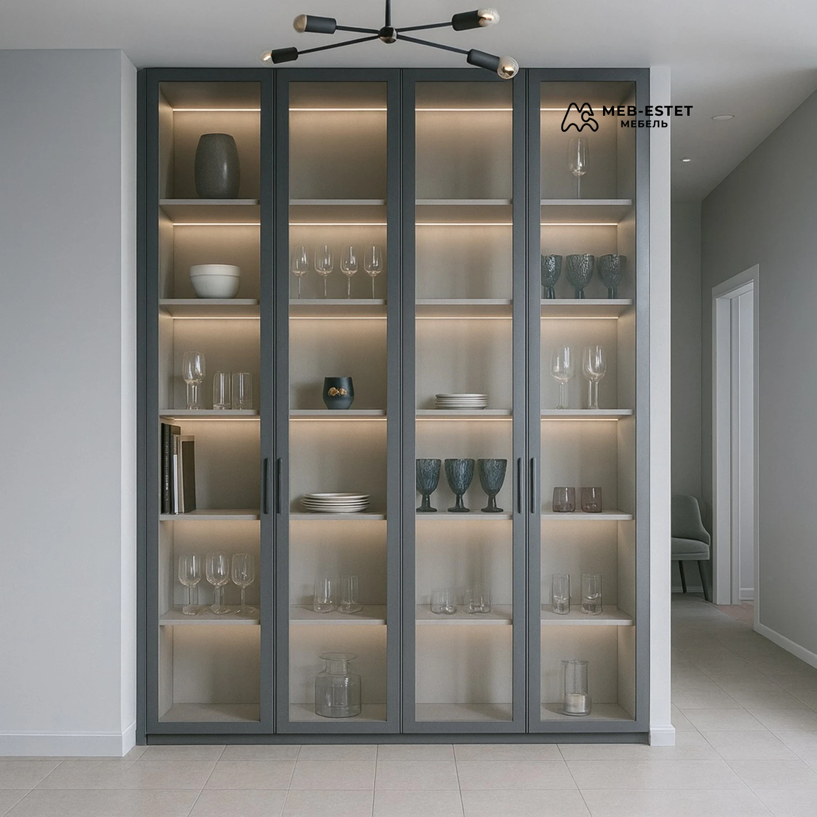 Высокая корпусная витрина в современном стиле — решение для демонстрации посуды и декора. Каркас из окрашенного МДФ с рамочными стеклянными дверцами и тонкой вертикальной ручкой. Внутренняя подсветка LED по полкам подчеркивает экспозицию и упрощает выбор предметов.