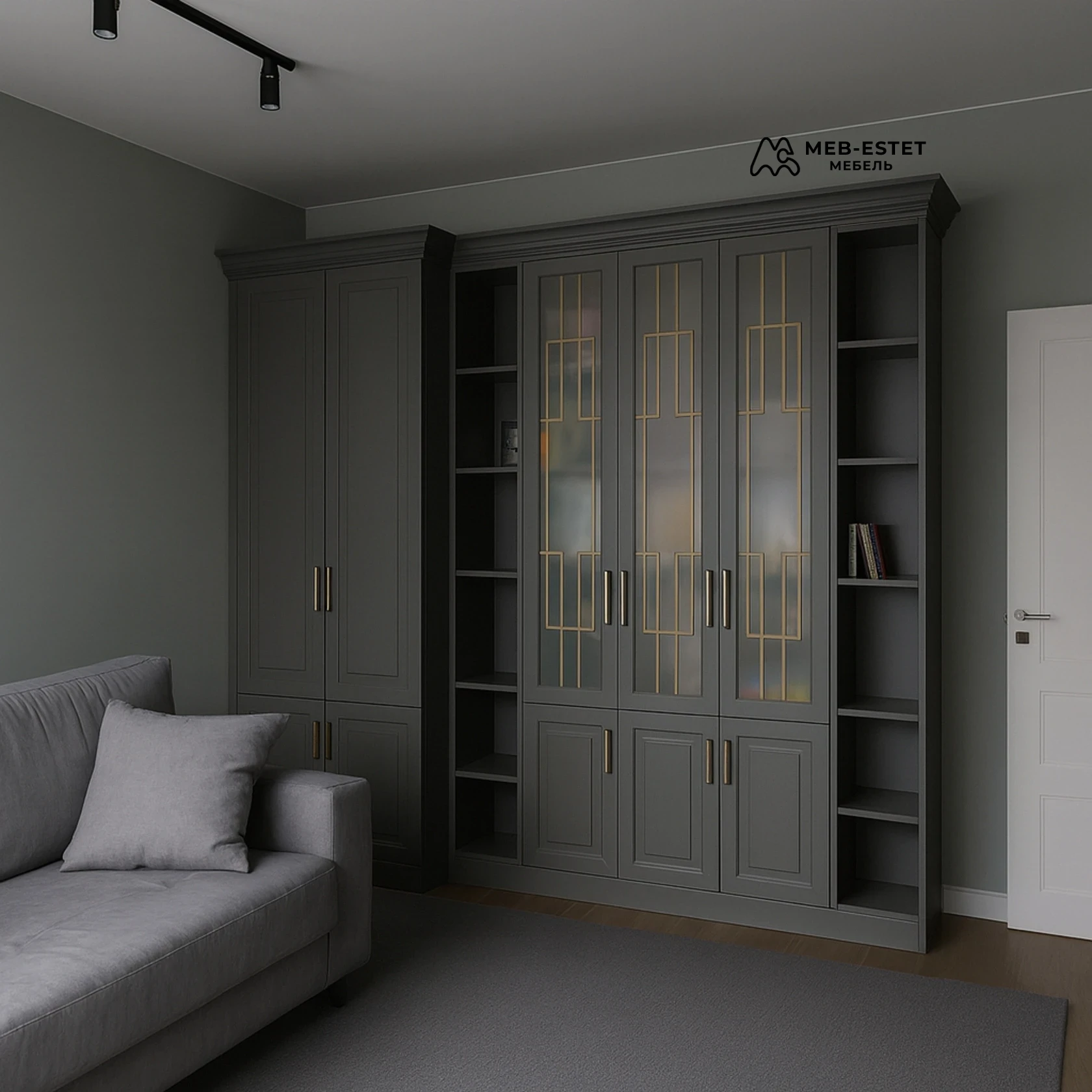 Элегантная корпусная стенка‑витрина в неоклассическом стиле. Выполнена из МДФ с матовой окраской глубокого серого тона, оснащена стеклянными дверцами с декоративным алюминиевым профилем и верхним карнизом.