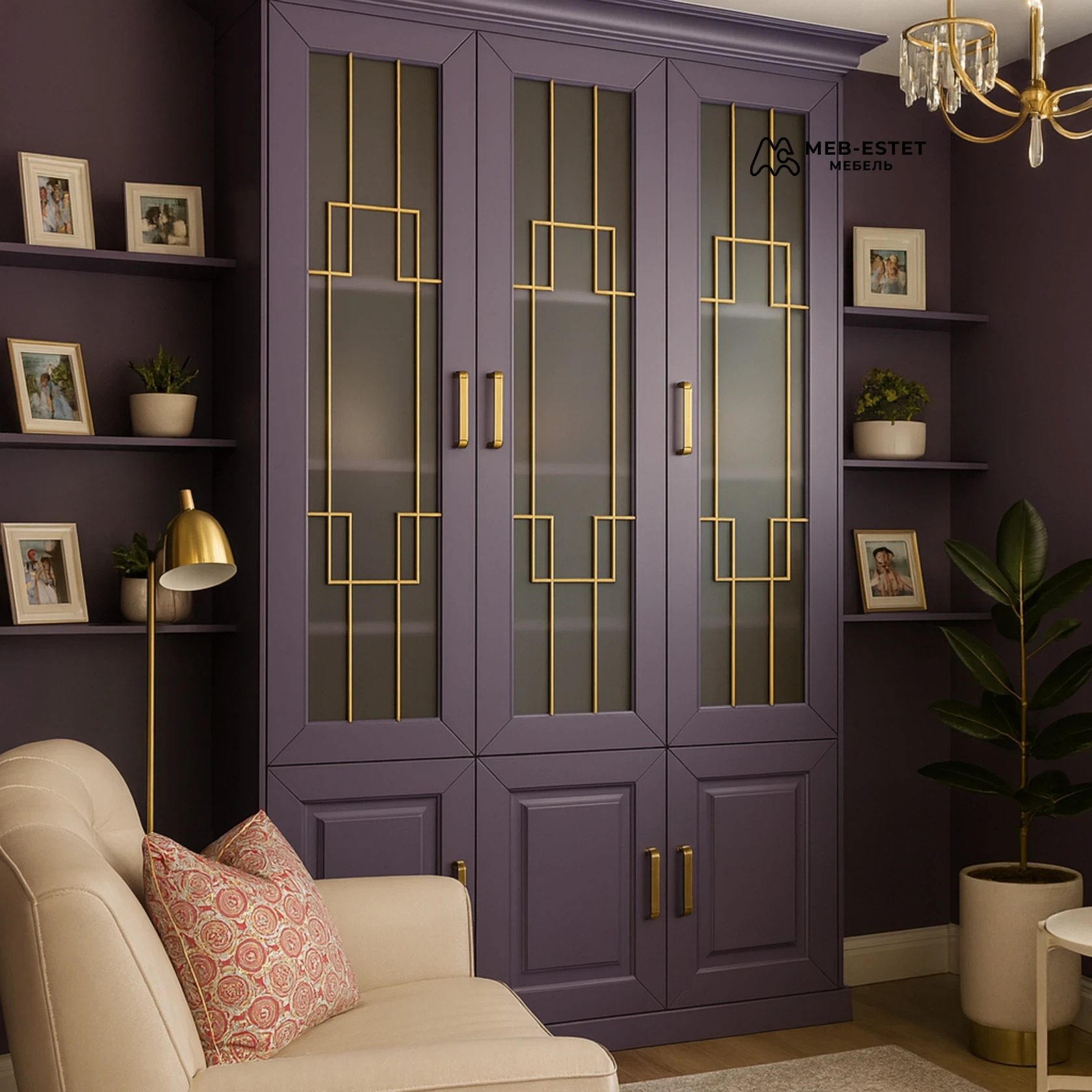 Высокий корпусный шкаф‑витрина в неоклассическом ключе. Корпус из МДФ с матовой окраской сиреневого тона, вставки из матового стекла и декоративная золотистая решётка создают элегантный акцент в гостиной или библиотеке.
