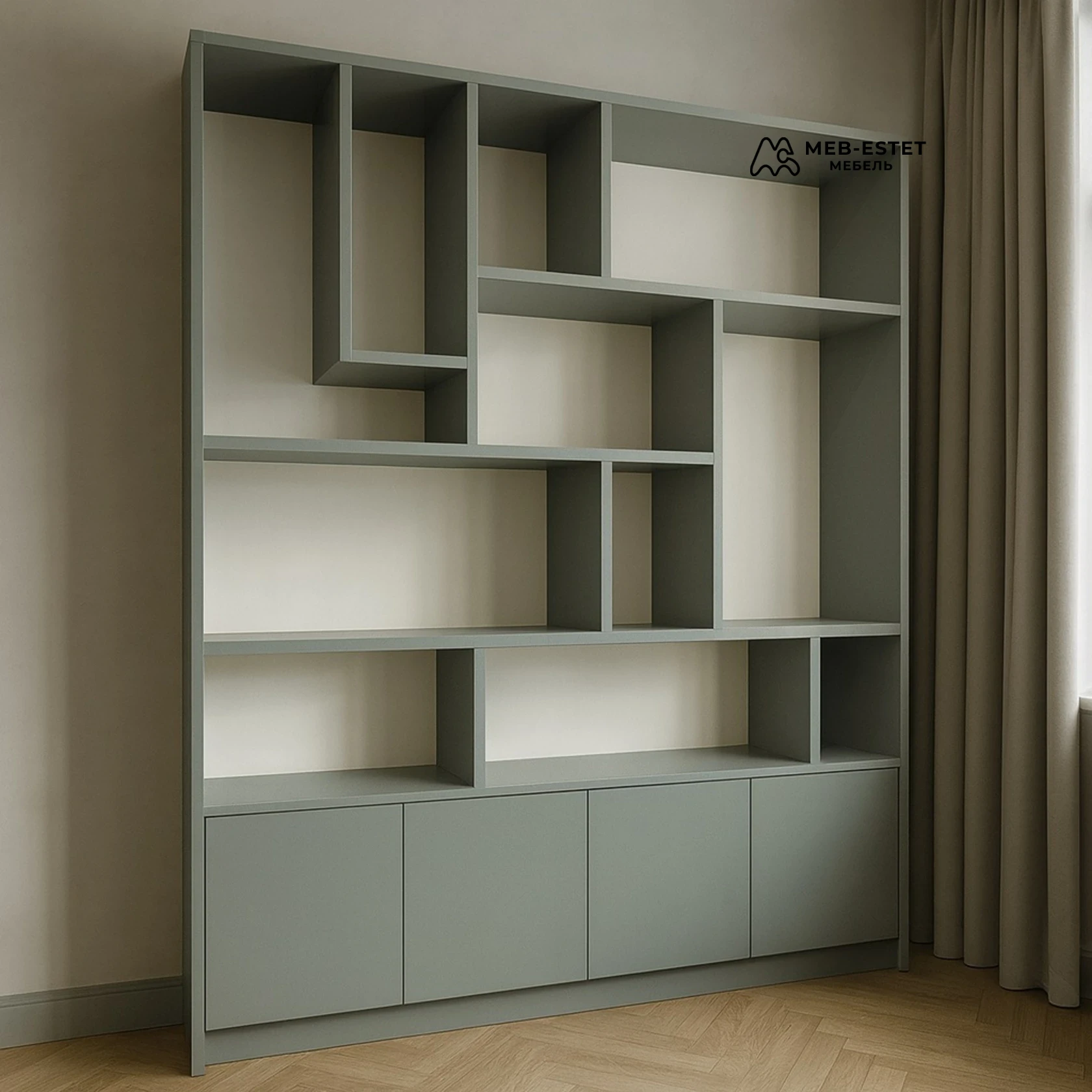 Модульный корпусный стеллаж с закрытой низкой тумбой — лаконичное и функциональное решение для гостиной или кабинета. Асимметричные полки обеспечивают удобную зону для книг, декора и техники, нижние фасады — скрытое хранение.