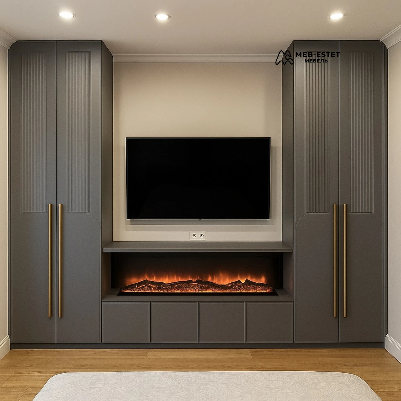 Комплексная стенка для гостиной: две высокие тумбы по краям, низкая база с выдвижными ящиками и ниша под встроенный электрокамин, место для настенного телевидения. Фасады — МДФ с реечной фрезеровкой в матовом исполнении, длинные металлические ручки.